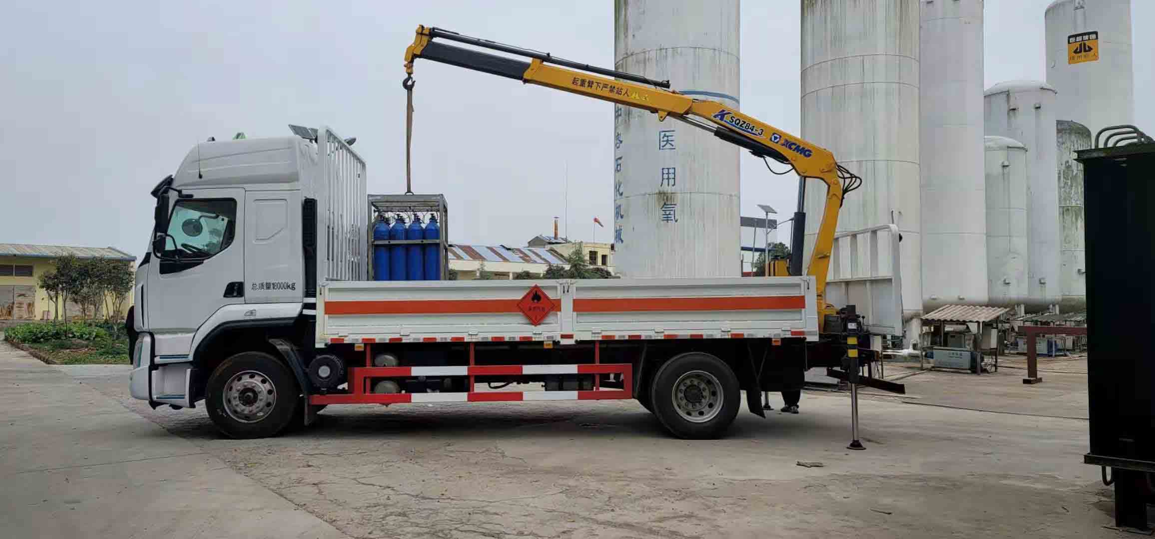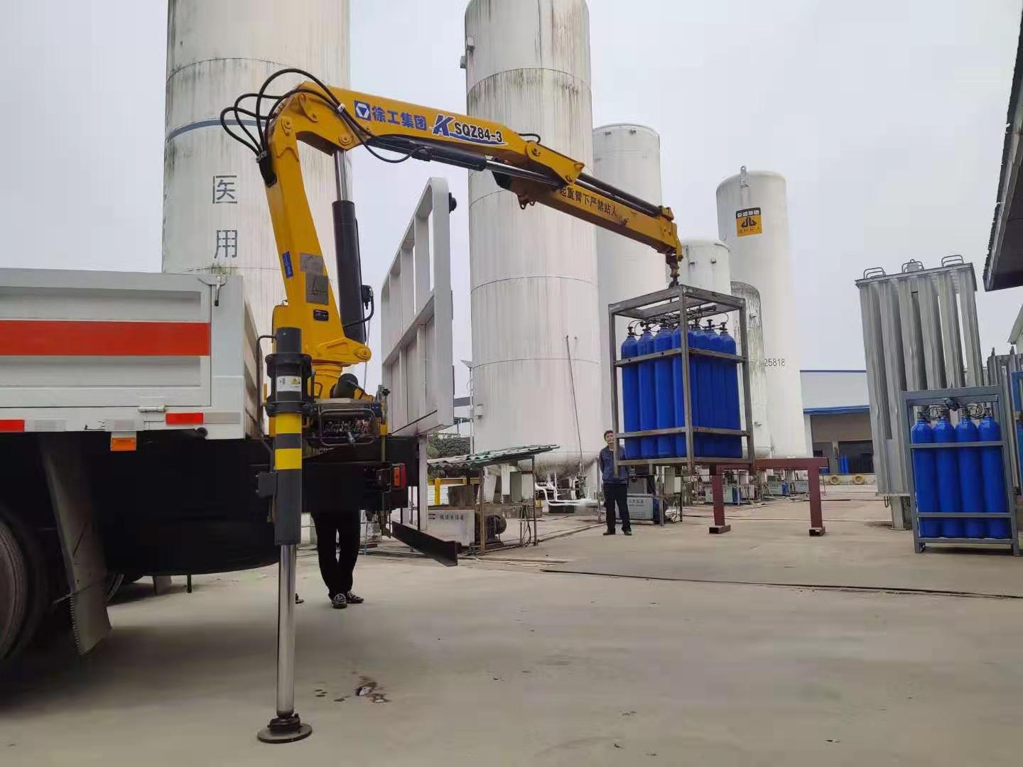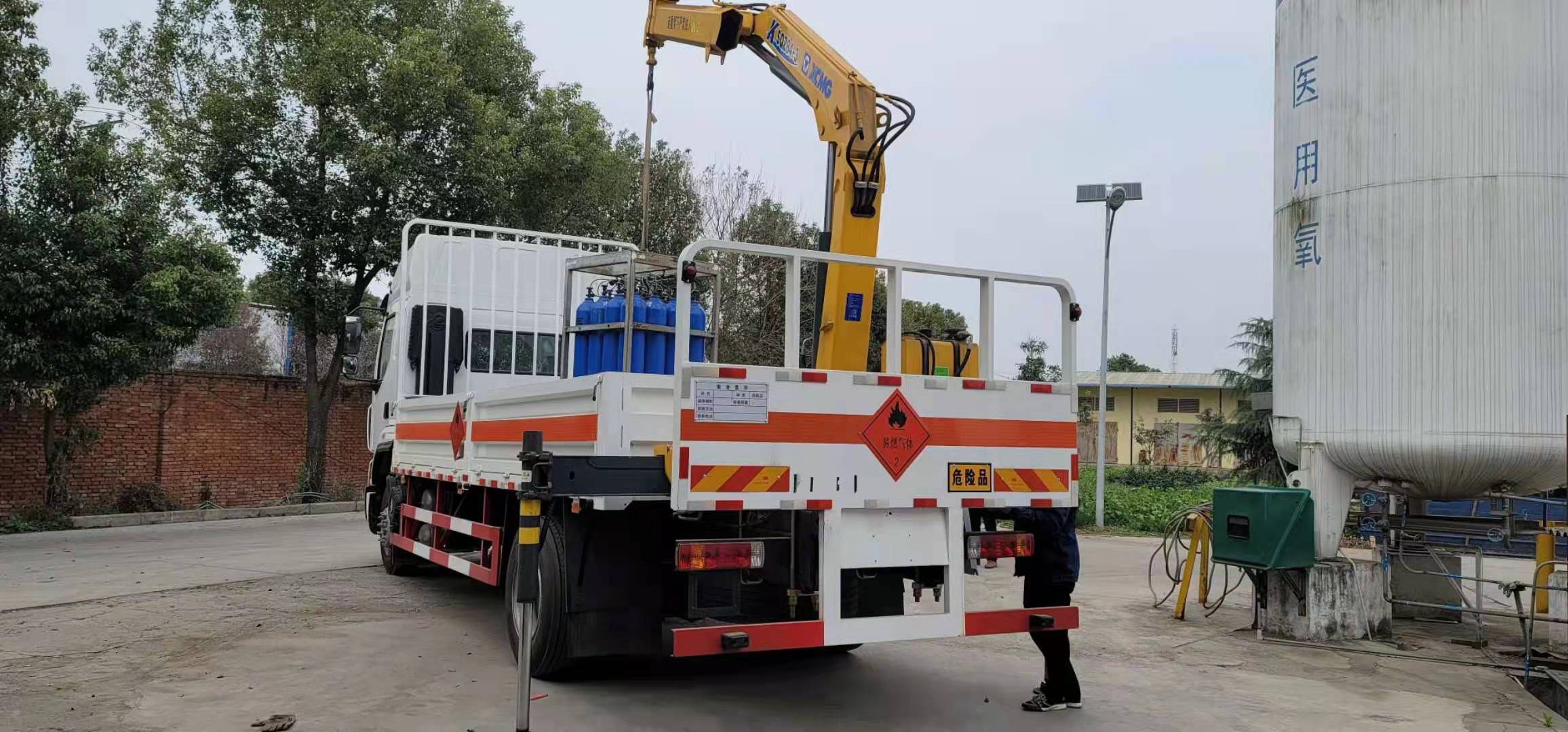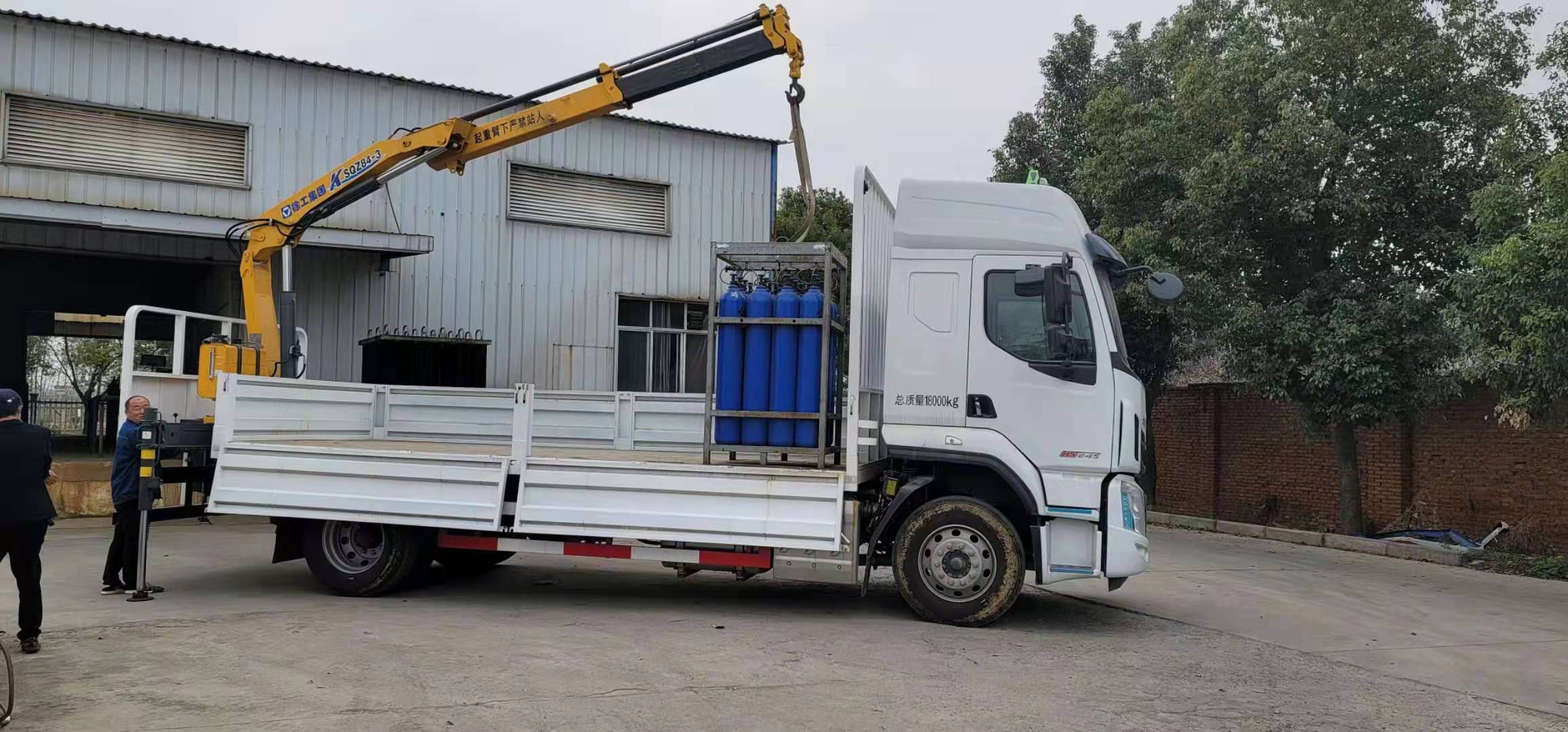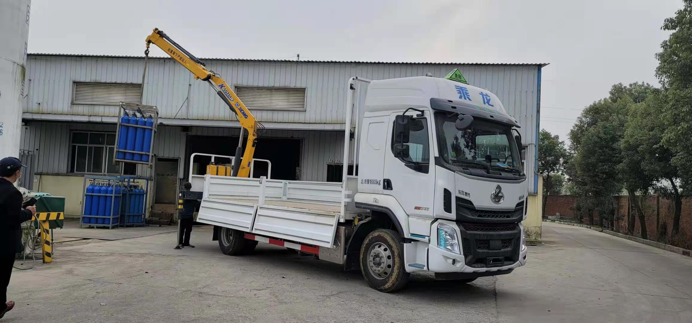 柳汽乘龍帶吊氣瓶車整車尺寸:9000×2550×3580mm;廂體尺寸:5800/5400×2420×600mm.按照公告尺寸制作,底板采用5MM花紋板制作,底板上鋪靜電膠皮,低欄瓦楞式,配備滅火器,三角頂燈,靜電拖帶等,嚴(yán)格按照國(guó)家危險(xiǎn)品法規(guī)進(jìn)行“易燃?xì)怏w”標(biāo)識(shí)粘貼等,配徐工4噸3節(jié)折臂后置吊機(jī),舉升高度10.2米.工作半徑7.3米水平全部伸縮完畢吊重2噸不在話下.