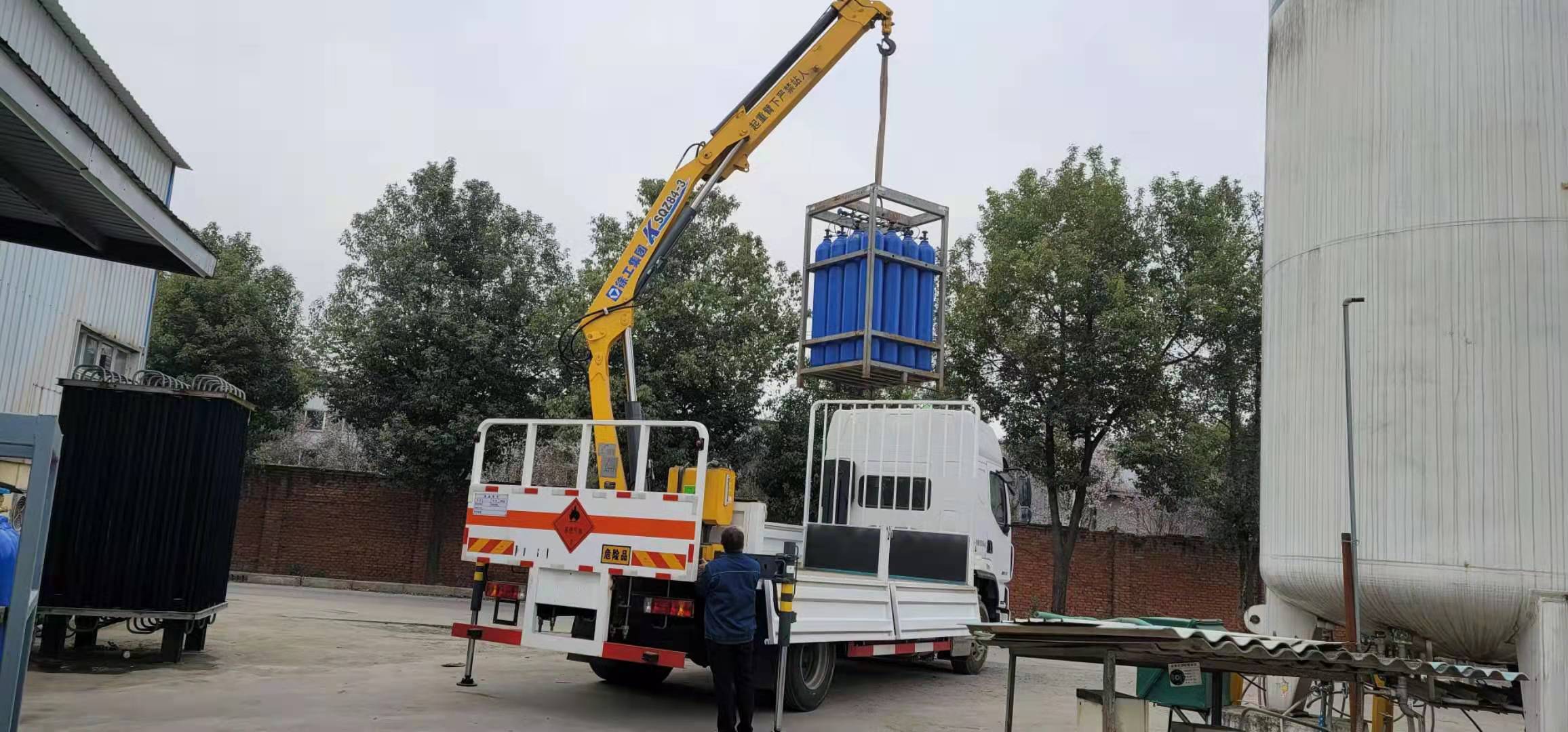 遠(yuǎn)看是隨車起重運(yùn)輸車,近看是倉(cāng)柵運(yùn)輸車。原來(lái)是帶吊機(jī)的氣瓶運(yùn)輸車。該車專業(yè)運(yùn)輸危險(xiǎn)品2類:可燃?xì)怏w2.1,不然氣體2.2等,該車省時(shí)省力,安全性高。