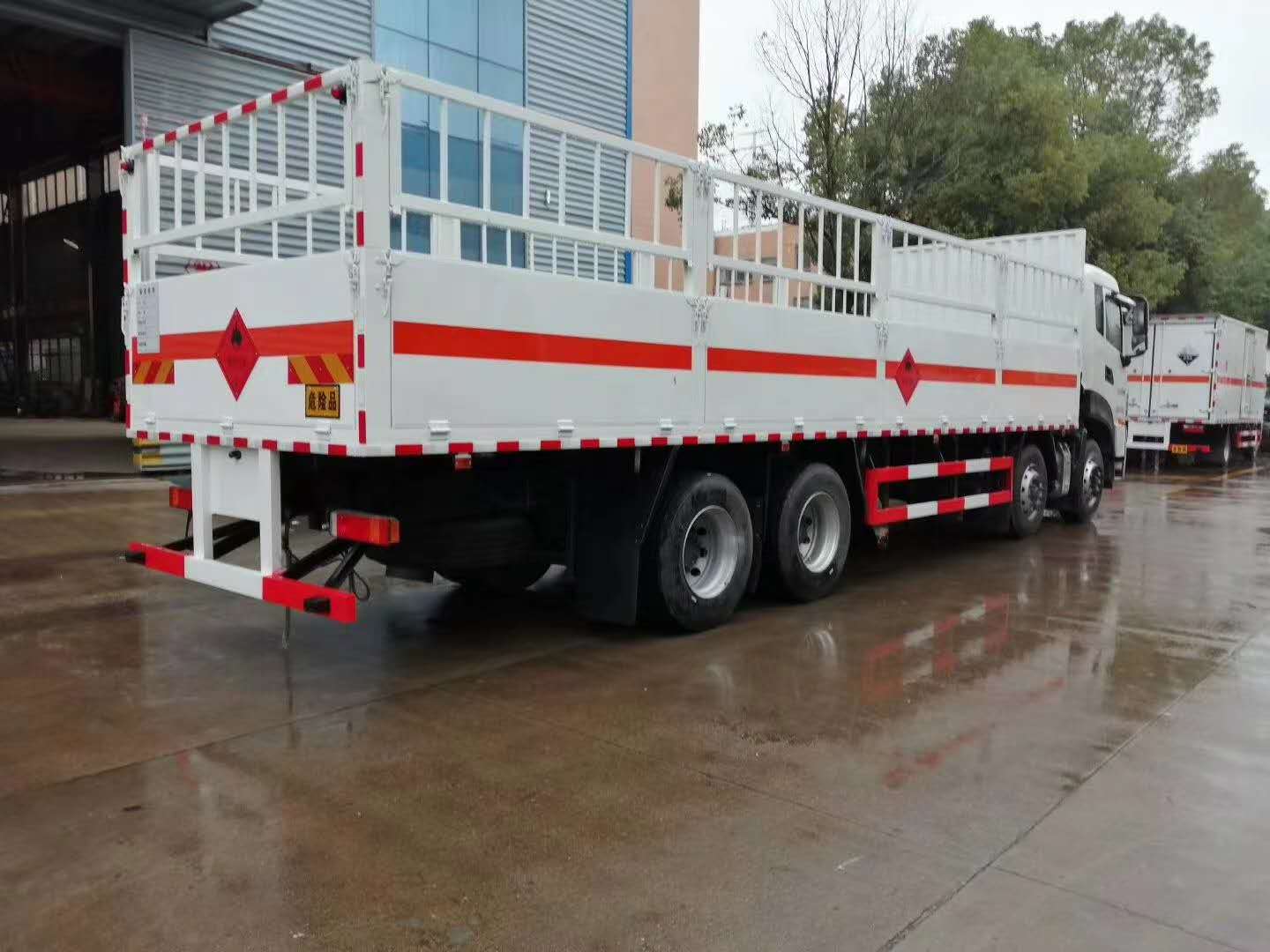東風天龍9米4國六氣瓶運輸車廂體嚴格按照公告尺寸制作,箱體采用廂式欄板車結構,外厚度為1.1毫米厚度武鋼冷軋鋼板(或沖壓成瓦楞板,以公告為準),內加強“幾”字型加強梁,車體底板加強處理并做防靜電處理。車體的左側、右側,和后欄板栓鉤結構,可向下打開,方便上下貨物,車體為空曠式車型,大大減少了運輸物品因為狹窄空和強烈碰撞產生氣瓶爆炸的危險性,箱體外觀涂裝白色油漆,在欄板的中間位置粘貼橙色的危化車標帶,并在車體的左、右、后部粘貼“易燃氣體”或“不燃氣體”標識。駕駛室內部配備兩只滅火器,后保險杠處安裝防追尾事故的緩沖固定塊。此款車輛屬于國家規定的危險品二類倉欄式運輸車。廂體內部有固定貨物的臥環,車輛外部有靜電帶、滅火器、防火罩,車廂內安裝煙霧報警器和門防盜報警器,嚴格按照國家危險品相關法規張貼。