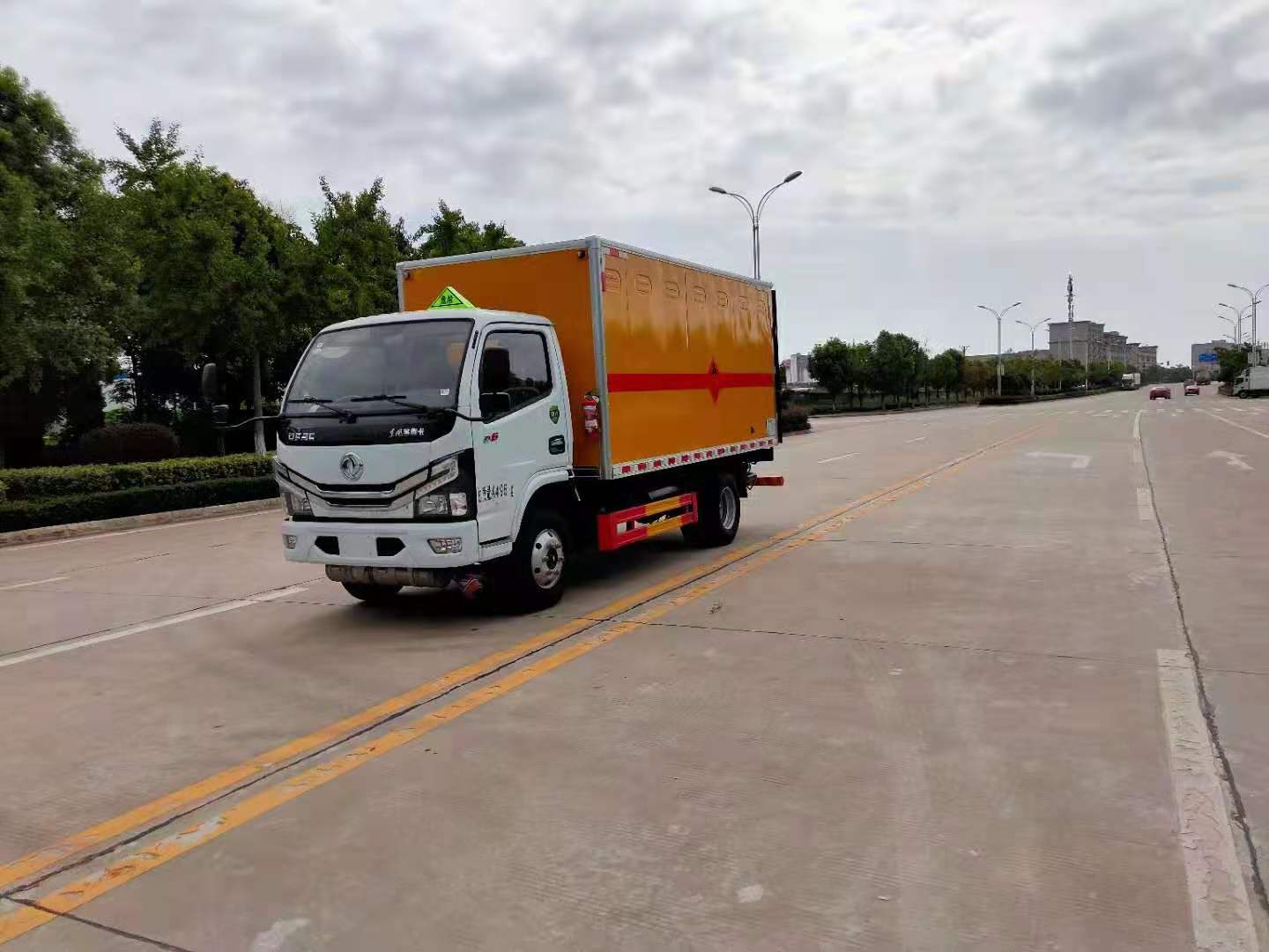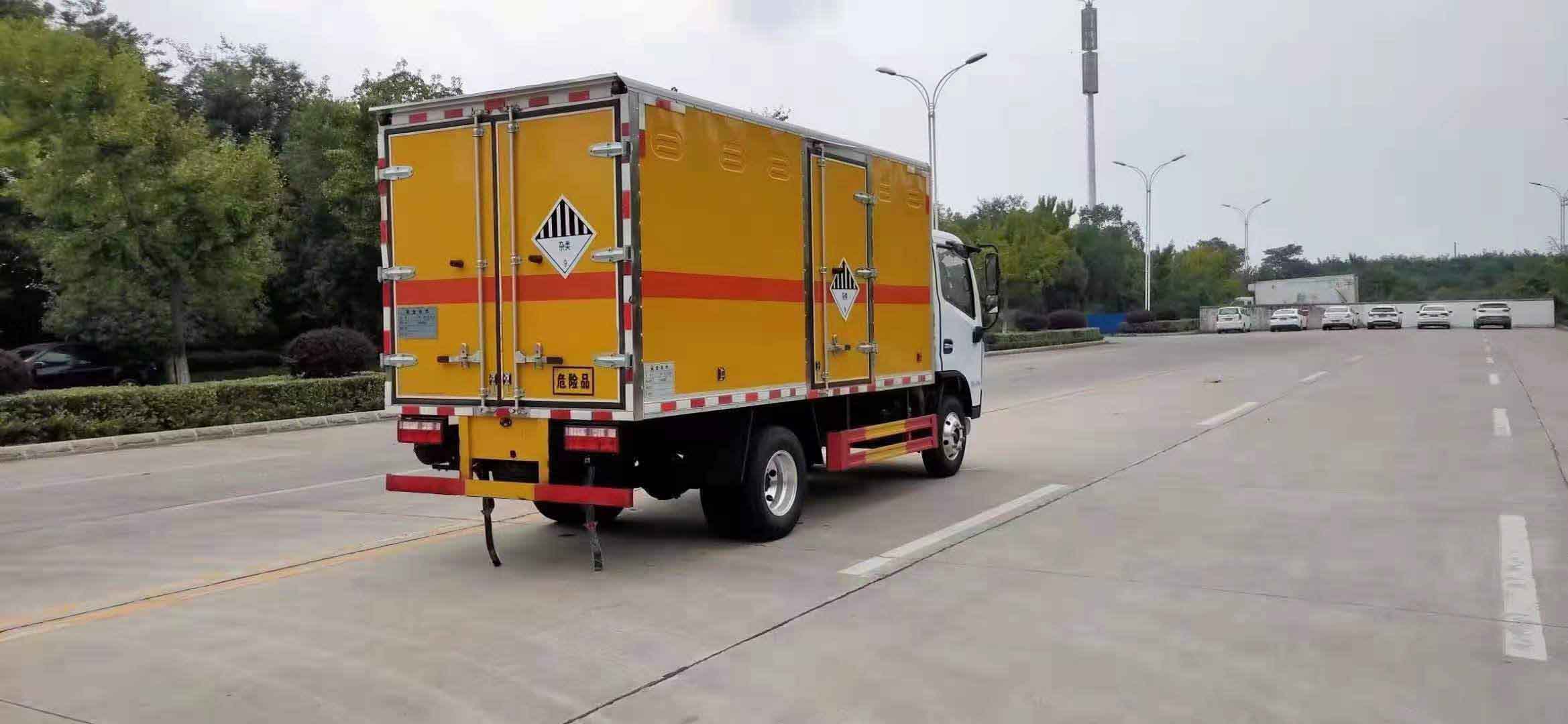 東風國六全柴115馬力雜項危險品車嚴格按照公告尺寸制作,外板采用1mm厚冷軋板有一次性成型的百葉窗,內飾為導電性能良好的鋁板有透氣孔,內襯為矩形管骨架牢靠穩定,內部填充為透氣防潮阻燃的擠塑板,四種材料經現代工藝復合而成,廂體外部上下鋁合金型材包邊,底板和車廂前下部鋪橡膠皮,后門雙開,右側中部單開門,霧報警器和門防盜報警器,嚴格按照國家危險品相關法規張貼。