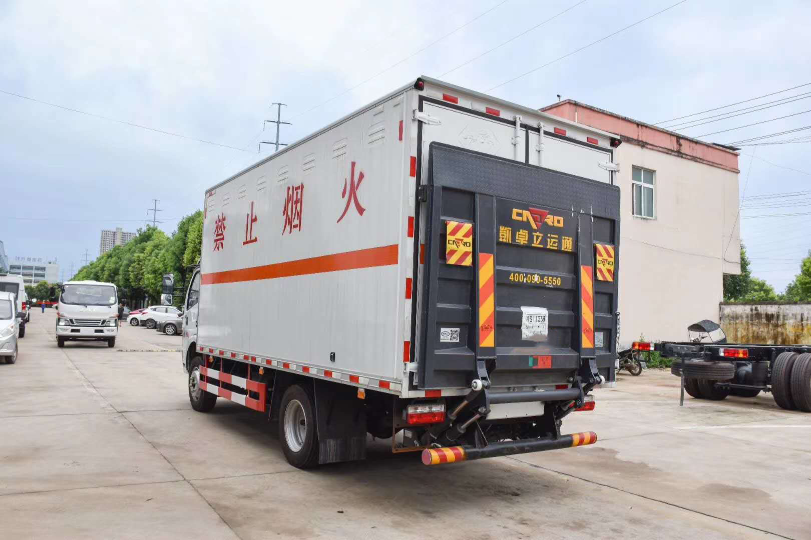 東風(fēng)凱普特K7腐蝕品廂式車側(cè)板為方管金屬骨架結(jié)構(gòu),外部卯冷扎鋼板,內(nèi)壁采用鋁平板蒙面,底板選用冷軋平板,平板上面鋪阻燃導(dǎo)靜電膠板,貨箱大梁根據(jù)車輛大小選用規(guī)格80mm 100mm 120mm槽鋼,橫梁規(guī)格60mm80mm,橫梁間距30-35cm。車廂側(cè)面裝有防雨功能自然通風(fēng)窗口。頂部裝有煙霧報警裝置。后門裝有防盜報警器。底盤裝有兩條拖地導(dǎo)靜電膠帶。車廂顏色為黃色、灰色、白色,貼有嚴(yán)禁煙火和反光標(biāo)識。