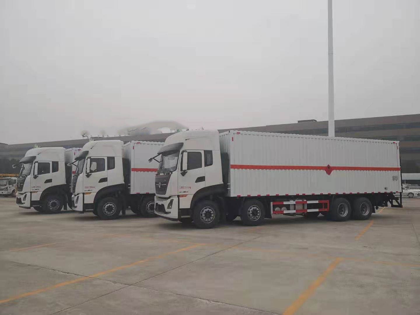 東風(fēng)天龍前四后八國(guó)六廂式運(yùn)輸車采用D320天龍KL駕駛室,龍擎DDi75E350-60發(fā)動(dòng)機(jī)(沃爾沃技術(shù)),陜齒9JS135TA變速箱,前5.5噸,后10噸,1995+4500+1350mm軸距,295/80R22.5 18PR真空胎,鋁350L油箱,帶空調(diào),電動(dòng)玻璃,遙控鑰匙,行車記錄儀,氣囊座椅,前盤,后鼓,ECU限速,后橋空懸。帶EBS(電控制動(dòng)系統(tǒng)),F(xiàn)CWS(防碰撞預(yù)警),LDWS(車道偏離預(yù)警),TPMS(前軸單臺(tái)胎壓監(jiān)測(cè))ESC,EACS(駕駛室氣囊調(diào)節(jié)),AEBS。外板采用1.2mm厚冷軋鋼板壓瓦成型,內(nèi)部槽鋼骨架,底板采用3mm花紋板上鋪設(shè)防靜電膠皮。廂體右側(cè)開對(duì)開門,后部設(shè)置對(duì)開門,廂體內(nèi)部?jī)蓚?cè)安裝捆綁貨物的臥環(huán)。廂體內(nèi)部安裝煙霧報(bào)警器及防盜報(bào)警感應(yīng)器。
