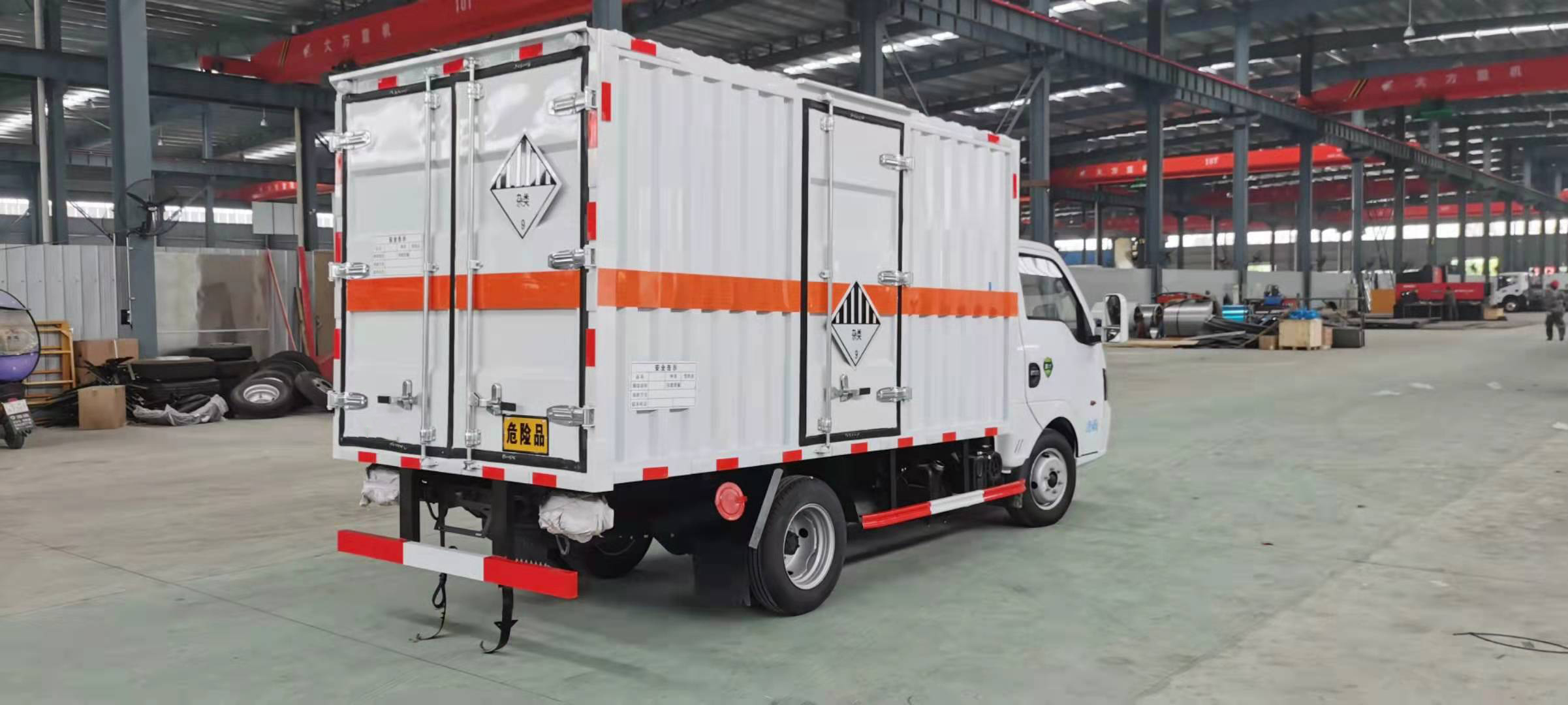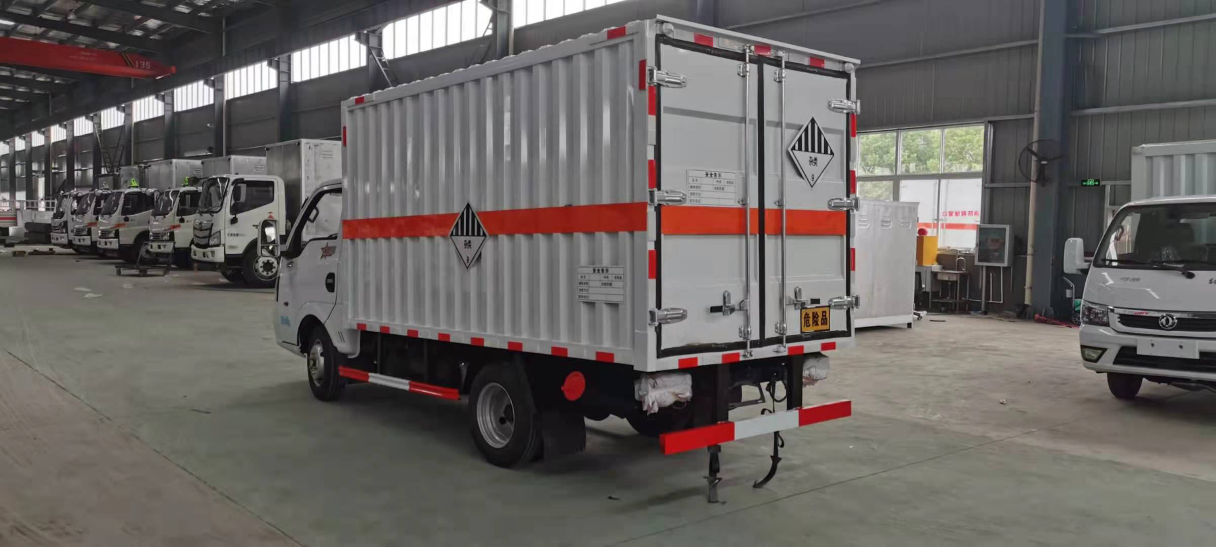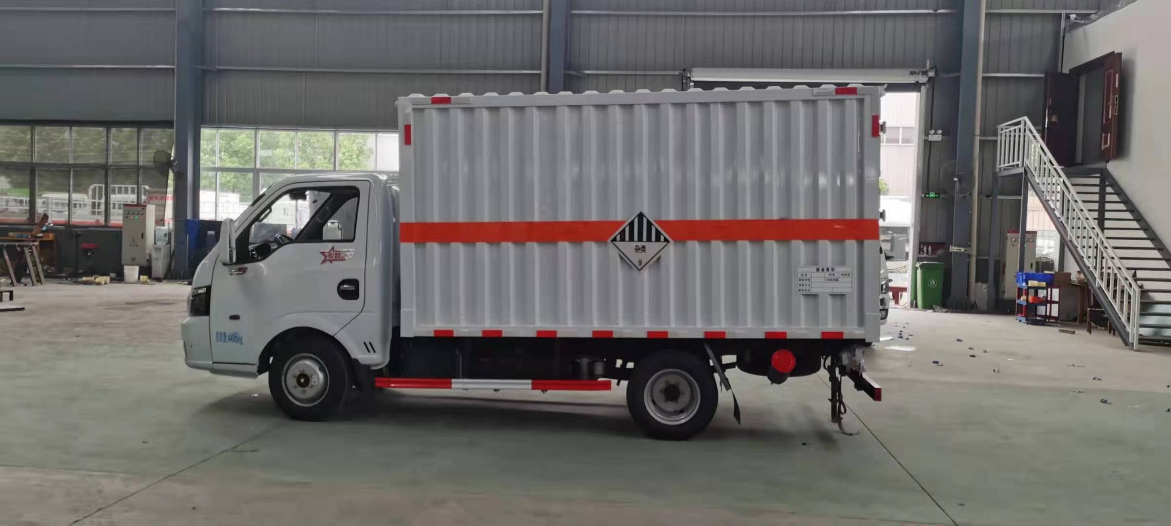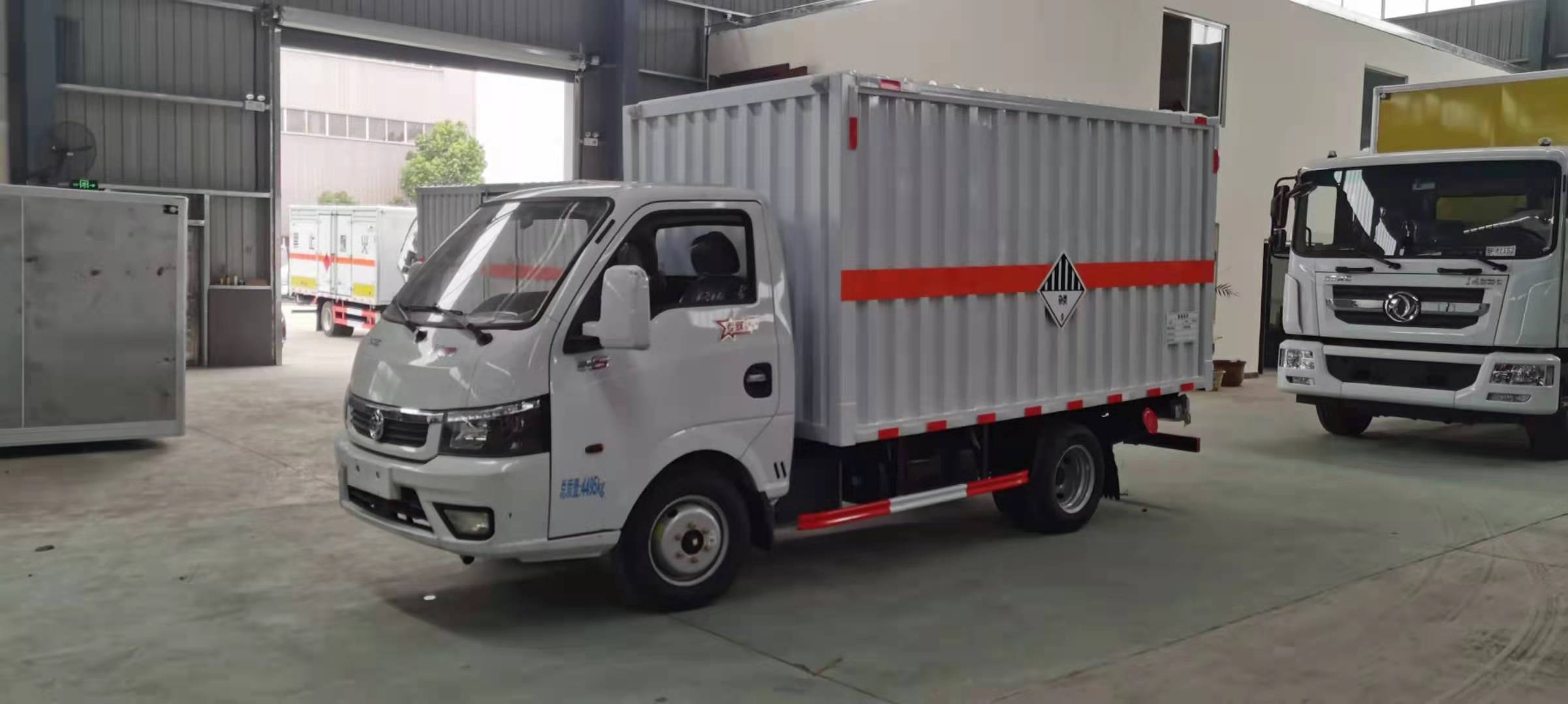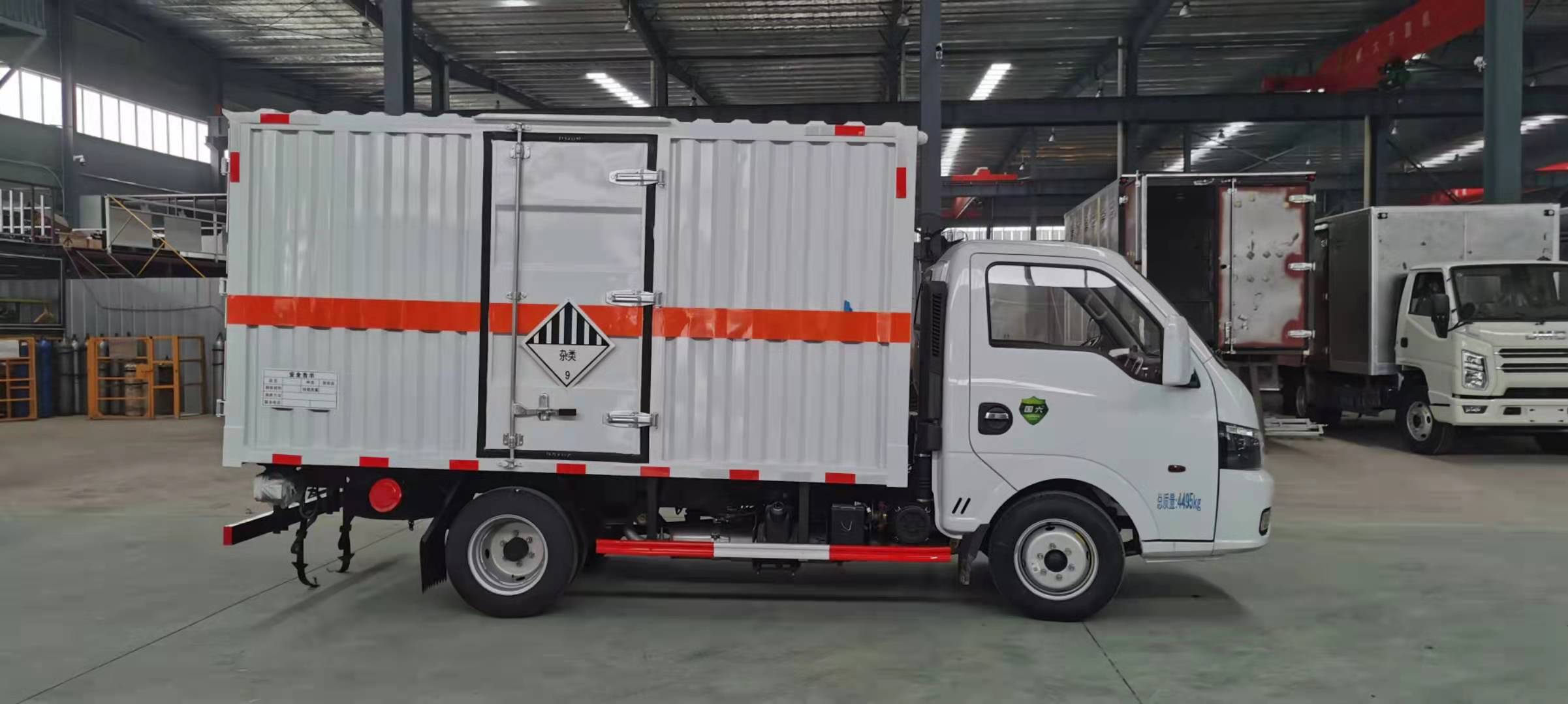 東風途逸柴油瓦楞板危險品車廂體采用采用1.2mm厚冷軋鋼板壓瓦成型,內部槽鋼骨架,底板采用3mm花紋板上鋪設防靜電膠皮。廂體右側開對開門,后部設置對開門,廂體內部兩側安裝捆綁貨物的臥環。廂體內部安裝煙霧報警器及防盜報警感應器。車輛尾部安裝兩條拖地導靜電膠帶,駕駛室頂部裝有安全三角燈。廂體顏色有:黃、白、灰色等可選。