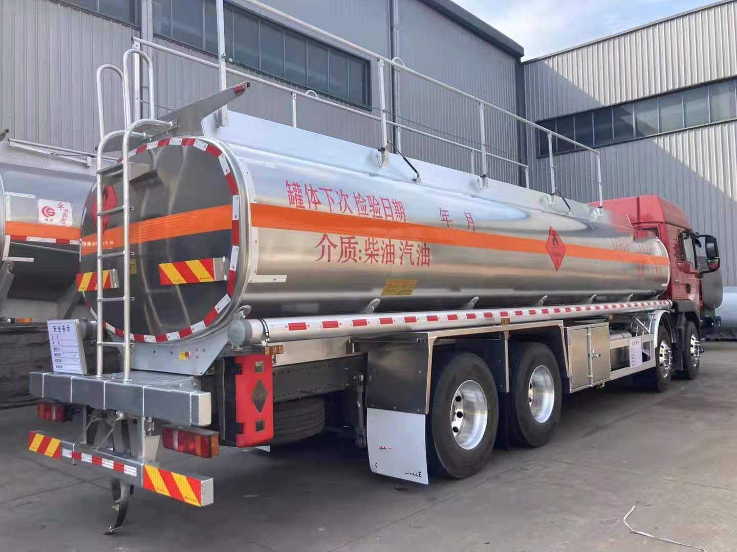 汕德卡國六26方鋁合金運油車罐體容積26方,均分雙倉,罐體通倉采用鋁合金5083(國產鋁合金),封頭厚7mm、筒體厚6mm、隔板厚6mm。2個歐標罐口,2個海底閥。整套歐標(防溢流探桿,下裝油口,油氣回收)。附件:鋁合金后保險桿,鋁合金副件(活動護欄,1個工具箱,出口箱,側護欄,防滑走道,后爬梯)。