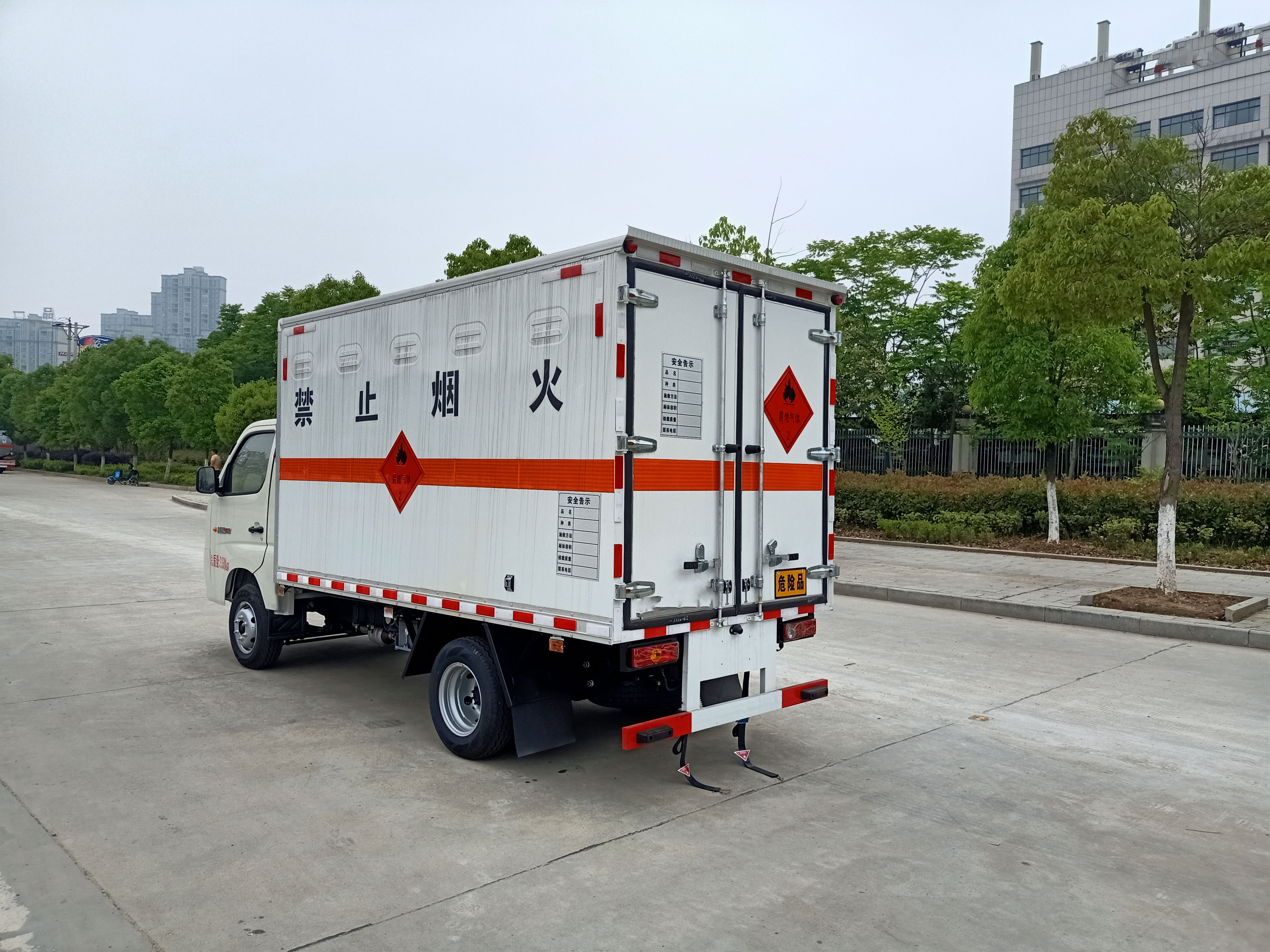 福田時代祥菱M2國六危險品車廂體為雙層金屬骨架結構,外冷軋鋼板內飾鋁板,內壁采用鋁合金板蒙面,夾層為隔熱阻燃材料填充,廂體內部做透氣網,中開側門,廂體內部做防靜電處理,廂體底部鋪導靜電膠板,車輛副梁配備導靜電帶,廂體內襯壁裝單排臥環,廂體內頂部安裝煙感報警器,廂體安裝防盜報警器。隨車配備手提滅火器,危險品三角頂燈,防護帽等,嚴格按照國家危險品法規進行標識粘貼等,其余廠家標配。