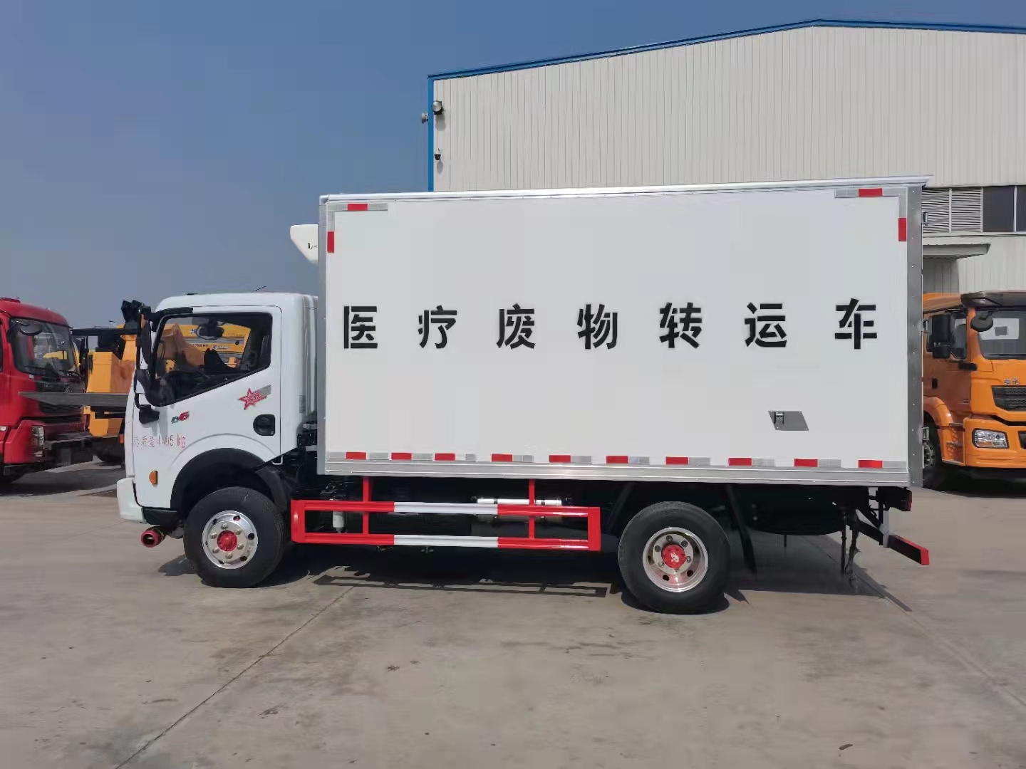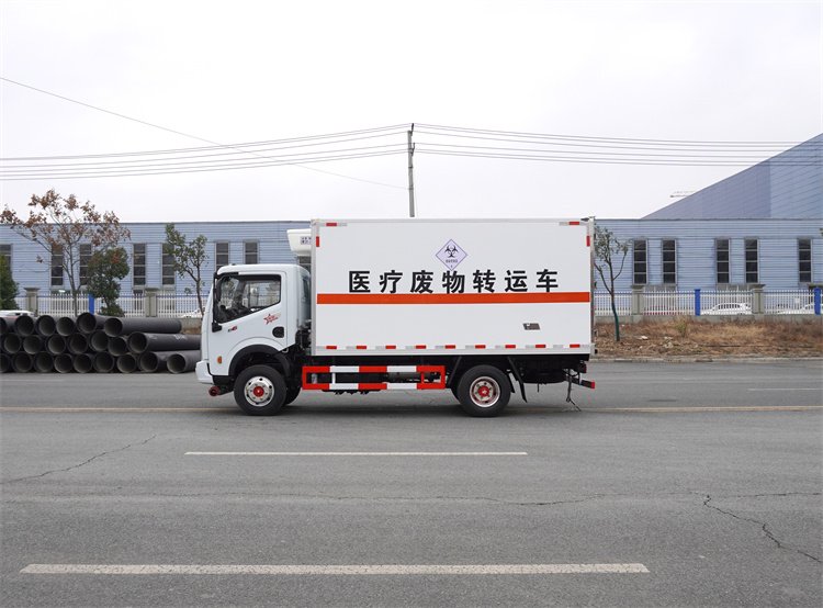 東風多利卡國六玉柴140馬力醫療廢物轉運車廂體保溫廂板外蒙皮為玻璃鋼板,內蒙皮為不銹鋼板,車廂內四周設置圓弧型不銹鋼及轉角,消毒和清洗時無清理死角。保溫層為硬質聚氨酯泡沫; 廂體為全密閉型,后門為雙層密閉結構(設置雙后門和內開門兩層門)確保廂體內盛裝的垃圾醫療與外界的隔斷,醫療廢物轉運車車廂分為貨物盛裝倉和醫用物品放置倉,在醫用物品放置倉外部(副司機方)開設單側門,方便醫用和醫療器械的存放, 醫療廢物轉廂體前、后和兩側設有醫療廢物和警識標識,駕駛。