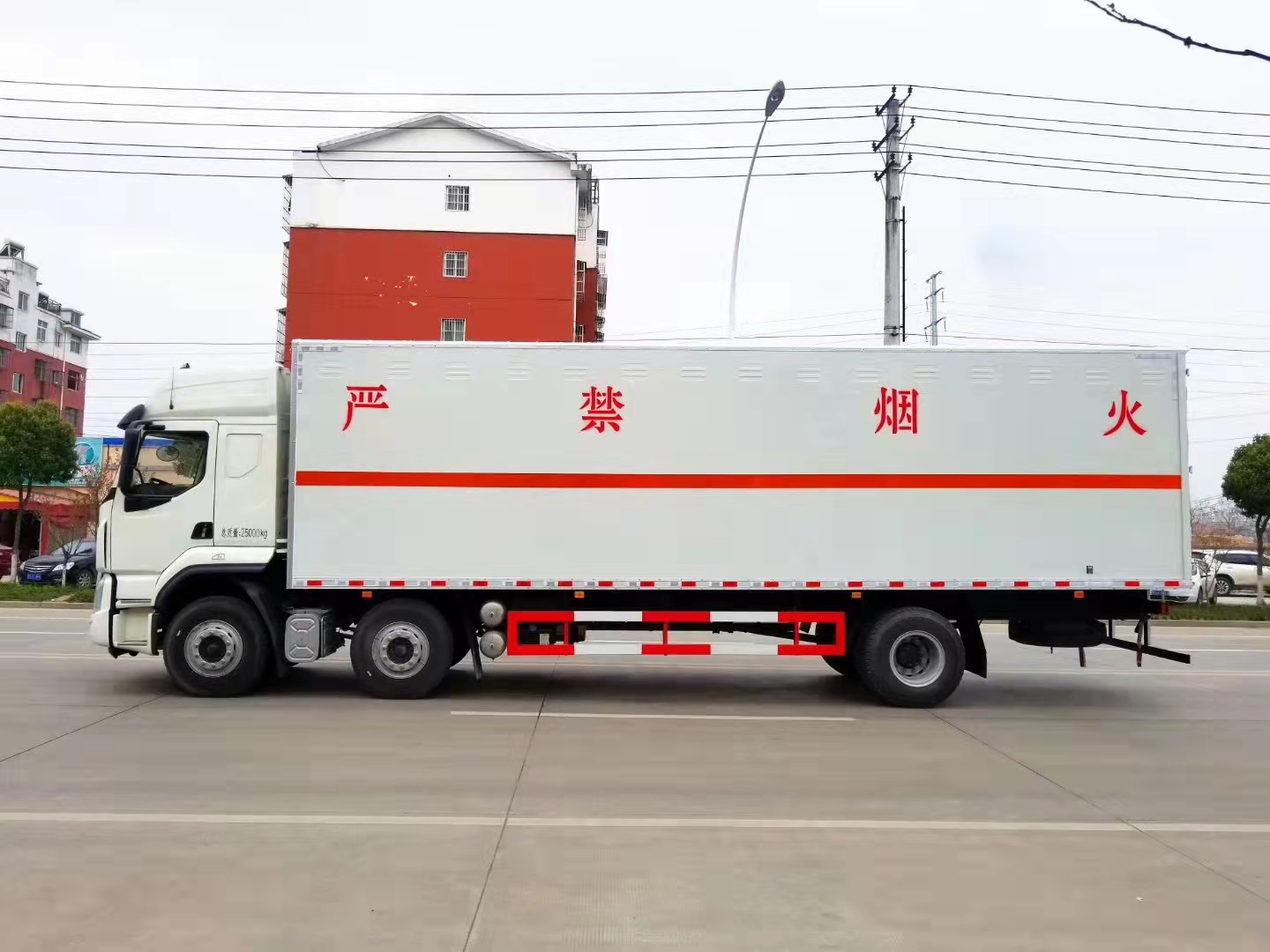 柳汽三軸9米6國六爆破器材運輸車整車尺寸:11900×2550×3960mm,廂體尺寸:9500×2400×2410mm。外板采用1mm厚冷軋板有一次性成型的百葉窗,內飾為導電性能良好的鋁板有透氣孔,內襯為矩形管骨架牢靠穩定,內部填充為透氣防潮阻燃的擠塑板,廂體外部上下鋁合金型材包邊,底板和車廂前下部鋪橡膠皮,后門雙開,右側選裝雙開門,內部有固定貨物的臥環,車輛外部有靜電帶、滅火器、防火罩,車廂內安裝煙霧報警器和門防盜報警器,嚴格按照國家危險品相關法規張貼危險品標識和反光標志等。