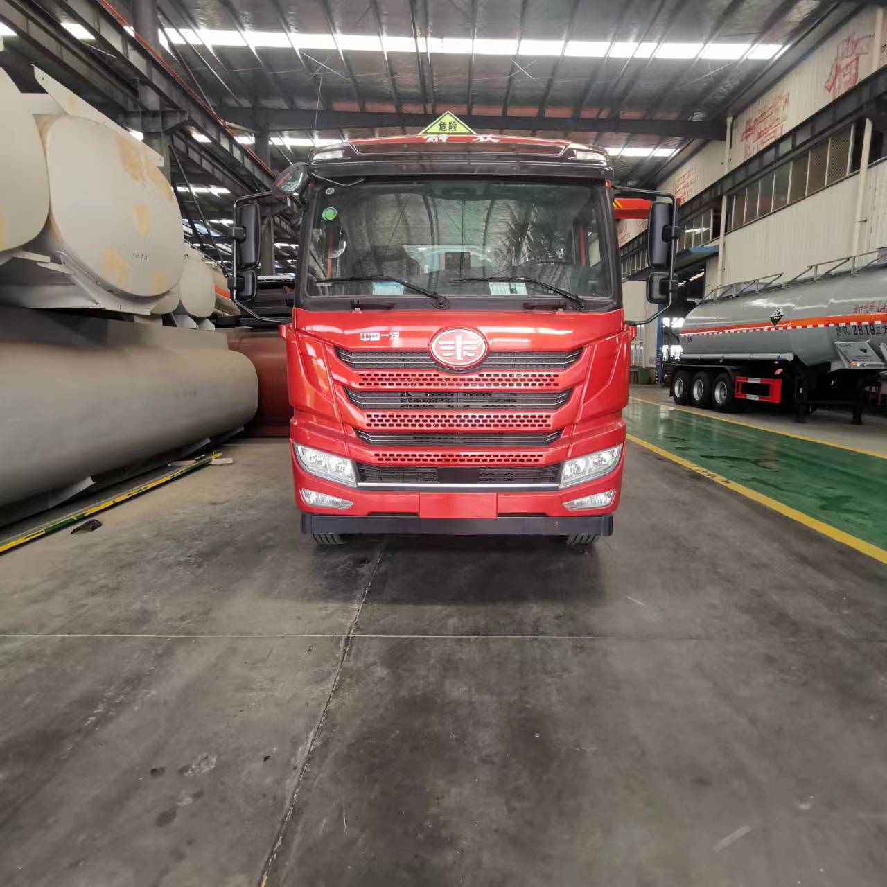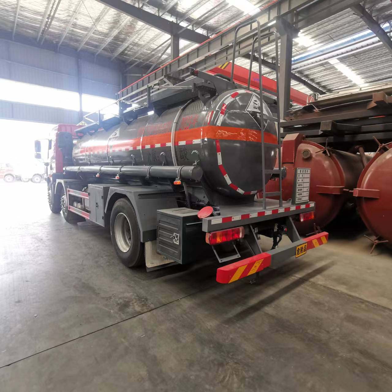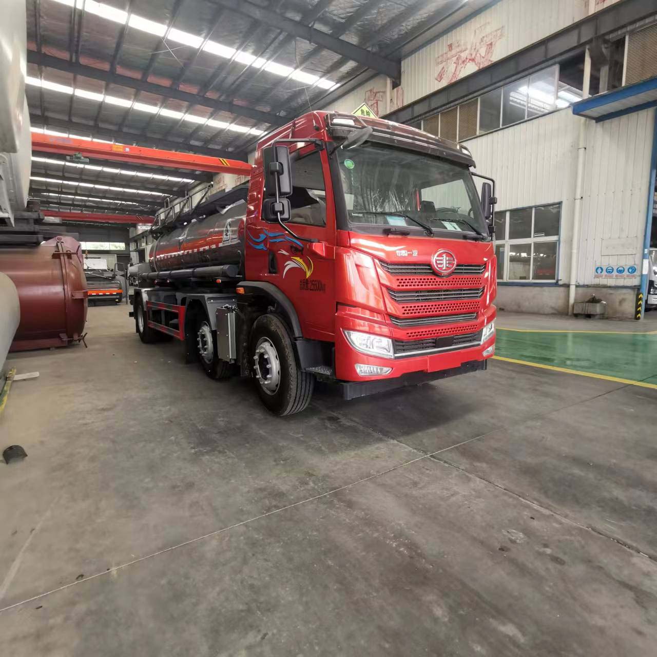 解放J6L三軸國六腐蝕品罐式運輸車罐體通倉,內襯聚乙稀塑20mm厚,一個歐標罐口帶全塑接酸盤,罐體頂部帶方盒子式上圍板,圍板內做重瀝青防腐。罐體尾下部帶一個DN100型不銹鋼襯四氟海底閥(海底閥帶聲光報警裝置),罐體尾部左右大梁下各一個自流口,用DN80型襯氟球閥控制帶外購全塑保護箱,不銹鋼升降護欄,花紋板走道,后爬梯,一個工具箱,兩個8KG滅火器,兩根PVC鋼絲軟管并帶PVC塑料炮筒管。