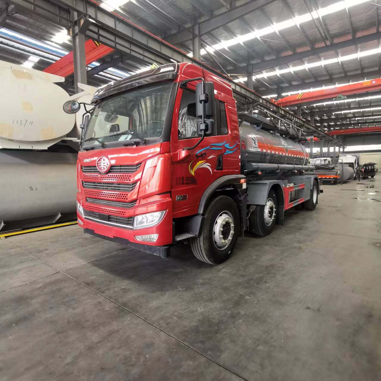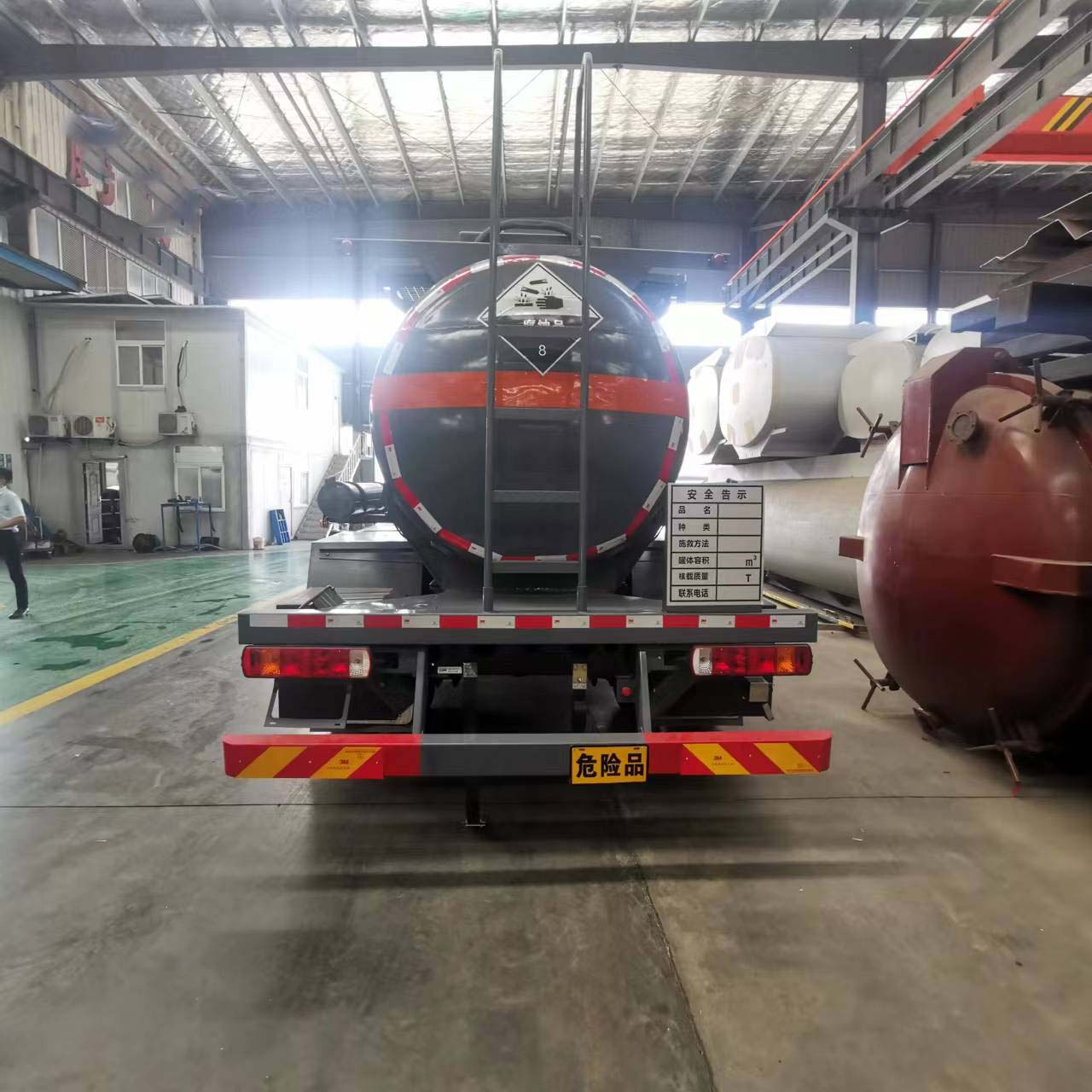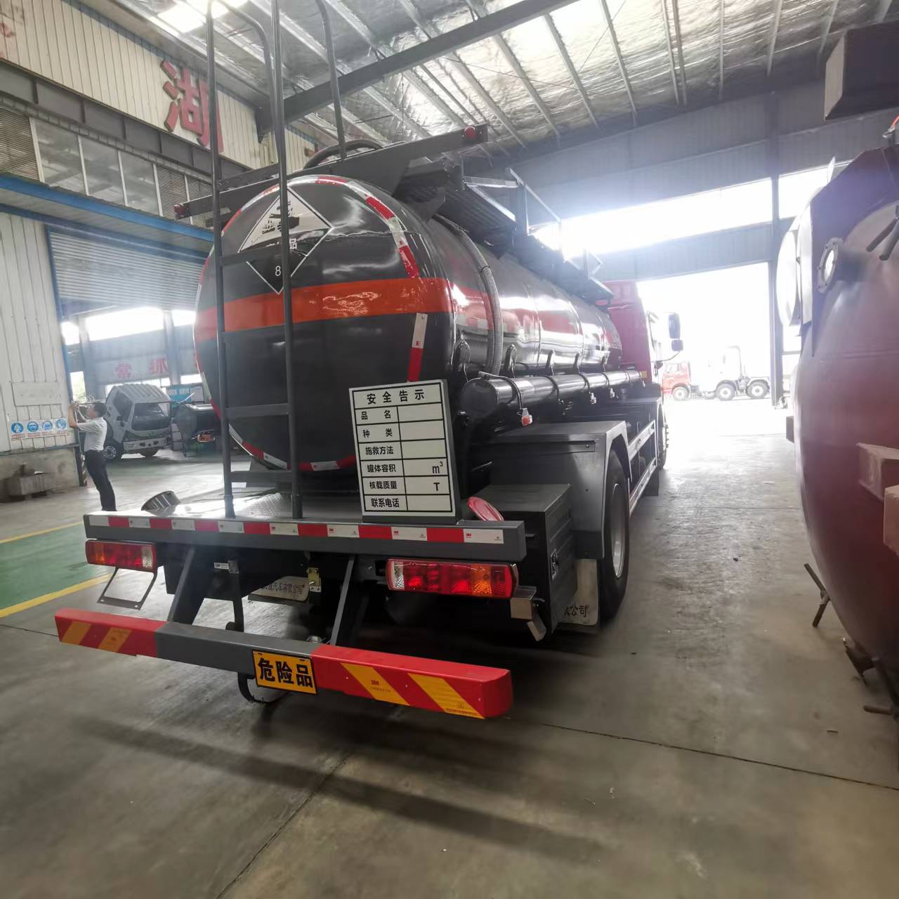 解放J6L三軸國六腐蝕品罐式運輸車罐體通倉,內襯聚乙稀塑20mm厚,一個歐標罐口帶全塑接酸盤,罐體頂部帶方盒子式上圍板,圍板內做重瀝青防腐。罐體尾下部帶一個DN100型不銹鋼襯四氟海底閥(海底閥帶聲光報警裝置),罐體尾部左右大梁下各一個自流口,用DN80型襯氟球閥控制帶外購全塑保護箱,不銹鋼升降護欄,花紋板走道,后爬梯,一個工具箱,兩個8KG滅火器,兩根PVC鋼絲軟管并帶PVC塑料炮筒管。