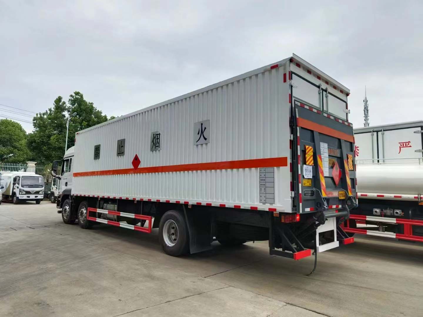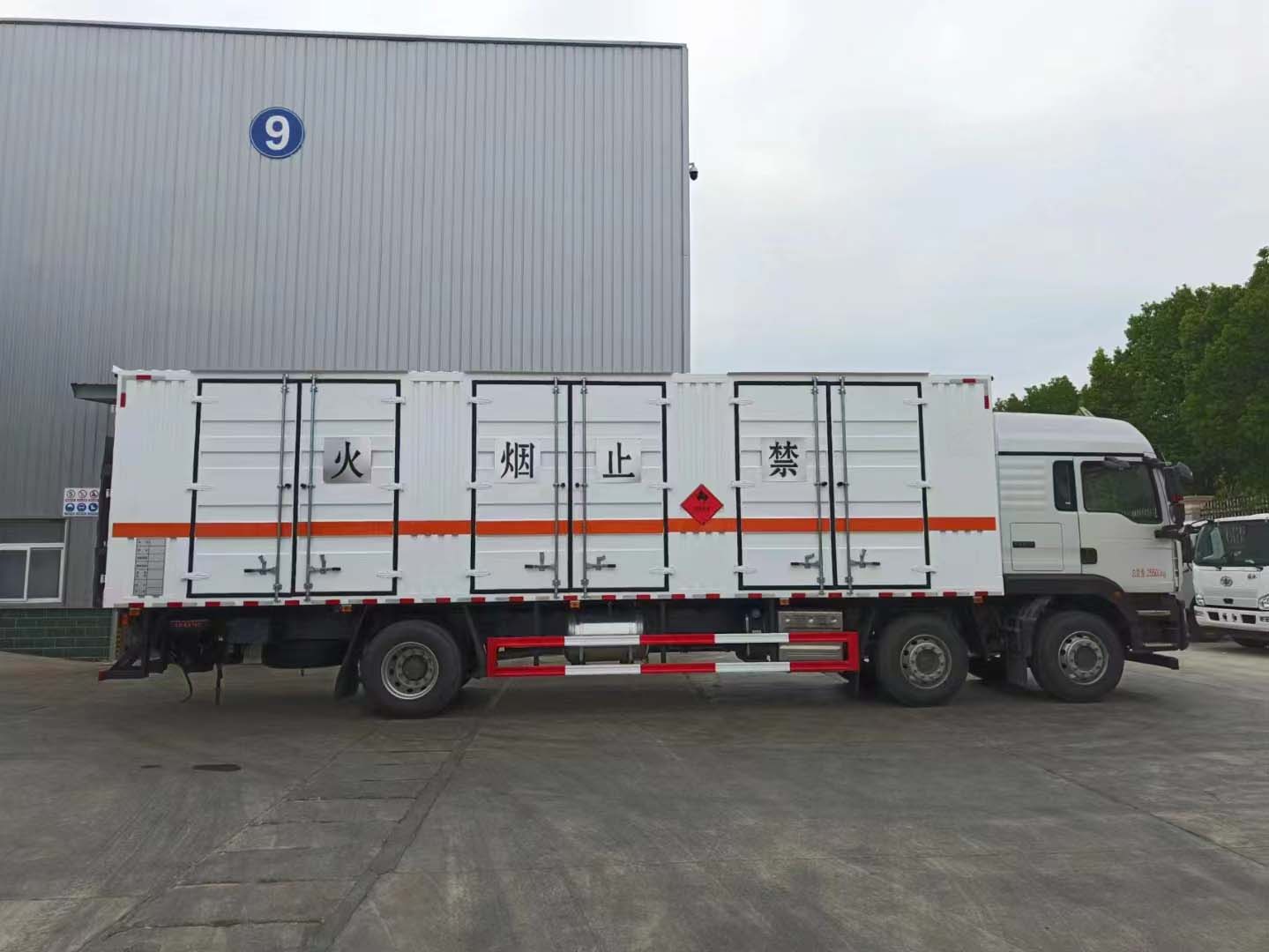 汕德卡G5暢行三軸國六雜項危險品車擁有高強度車身,帶前下視野及后視鏡全面優化。鋼鐵之軀,視野開闊。采用的是匠心之作,劍指高端。非凡實力,品質卓然。車身采用的是瓦楞板折彎而成,強勁動力,箱體為了裝貨方便采用的是帶三開側門箱體,尾部可選帶液壓尾板圖片,方便裝卸貨物。