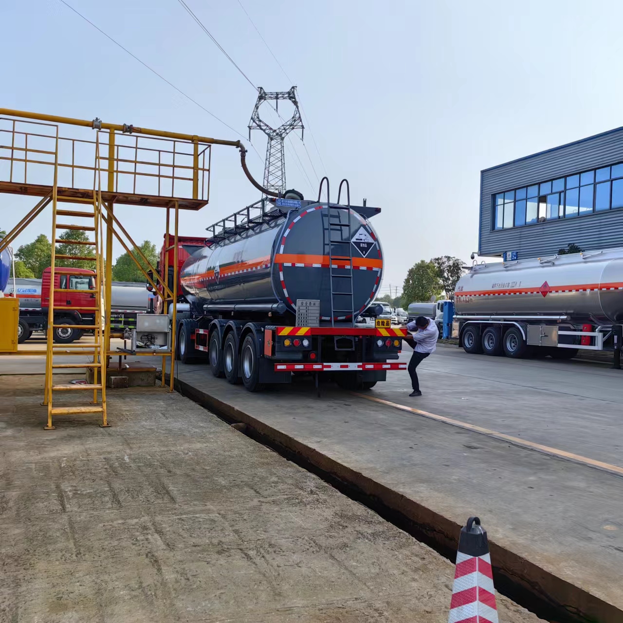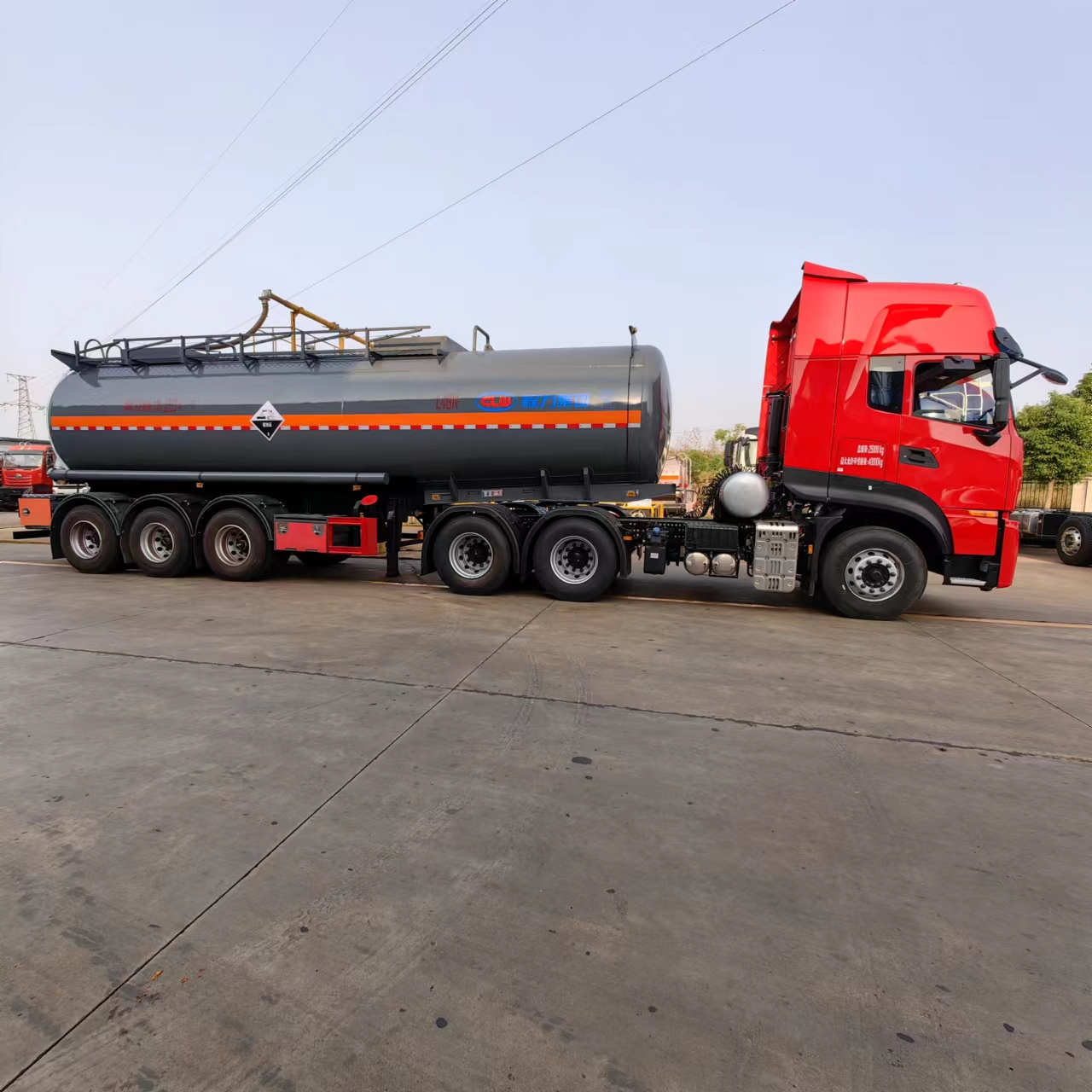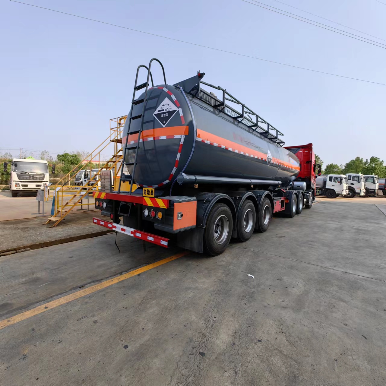 東風天龍高頂雙臥半掛腐蝕品運輸車罐體采用優(yōu)質(zhì)國標Q235碳鋼材質(zhì)制作,筒體厚度封頭厚度按GB18564-1設計,罐體內(nèi)部襯聚乙烯16mm厚。罐頂單圍板,圍板內(nèi)做防腐處理,兩側(cè)鐵質(zhì)活動護欄,罐頂兩個全塑進料口帶接酸盤(采用標配子口直徑為250mm),罐頂做落水管引至后封頭落水。罐體單倉,罐體內(nèi)防蕩隔板按技術設計。罐體底部一個DN100氣動不銹鋼襯四氟海底閥總控帶緊急切斷開關后保險杠控制(加裝5公里報警裝置),通過三通鋼襯塑管道,后尾部左右各一個DN80 鋼襯塑球閥帶DN80 PP出口,出口帶全塑保護箱。罐體兩側(cè)為PVC炮筒管,2根耐酸卸料軟管,2只8KG滅火器,罐體活動爬梯按公告圖片制作,三塊安全告示牌,按公告圖片張貼3M反光條、反光帶及腐蝕品標識。罐體顏色:深灰色,整車外觀及尺寸嚴格按照公告圖片制作。