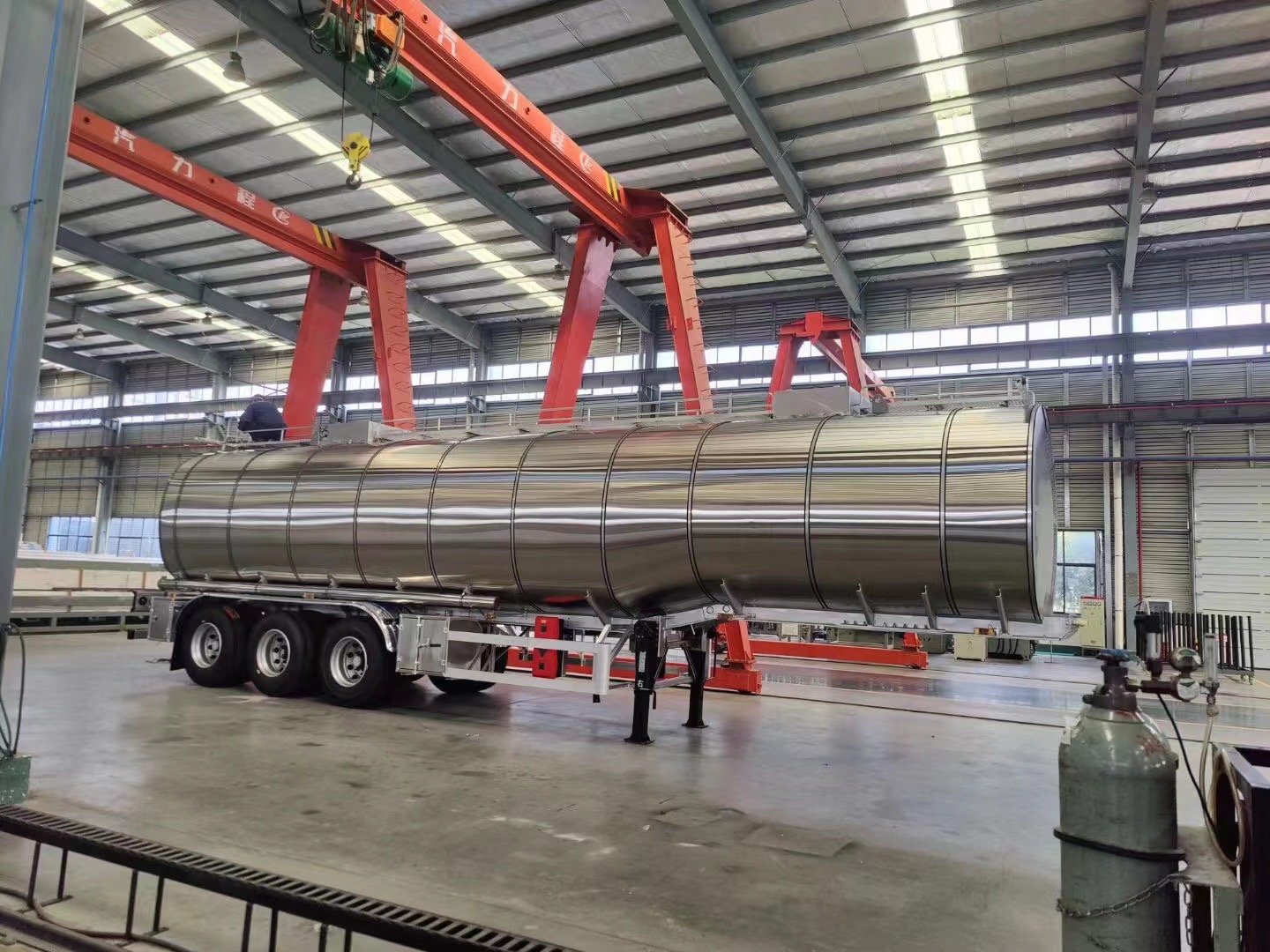 35方鋁合金液態(tài)食品半掛車罐體采用的是AL5182,封頭7毫米,筒體厚度5+6毫米,鋁合金漲型防波板雙面滿焊(雙面三角板加固);6道;出料口位置在罐體后尾部左右各一個(gè)4寸鋁合金球閥、加裝4寸鋁合金氣動海底閥。閥門全部采用的是鋁合金閥門形式,采用的是全保和304繃帶保溫形式,帶5cm普通玻璃棉,帶鋁合金加熱槽,縱梁采用的是L型全鋁結(jié)構(gòu),車軸采用的是14噸永利泰加寬ABS,加長螺絲自動調(diào)整臂,20噸的支撐,11*90*10鋼板彈簧規(guī)格,12R22.5 12PR輪胎,該車自重輕僅6.2噸,額載可達(dá)33噸。