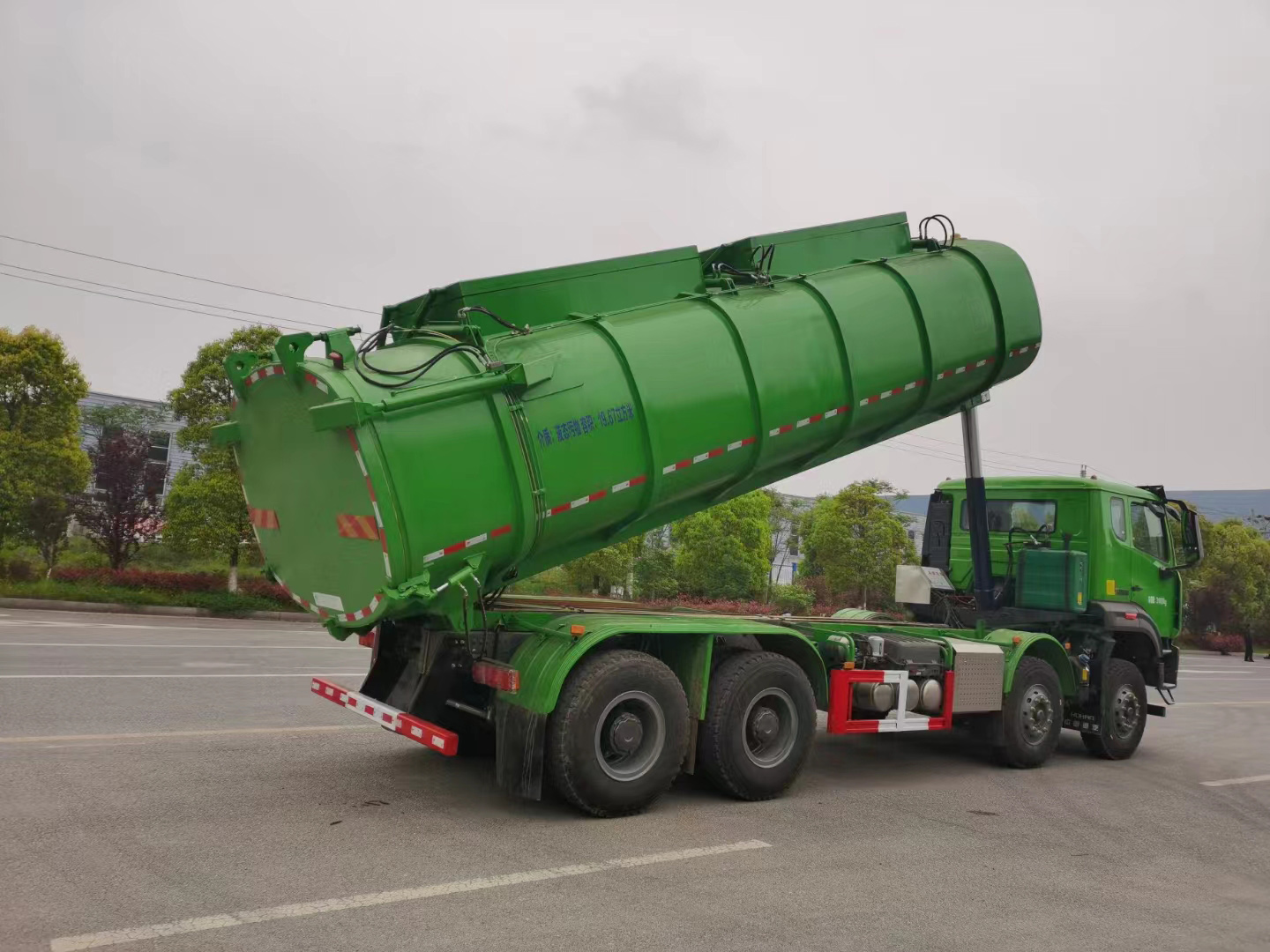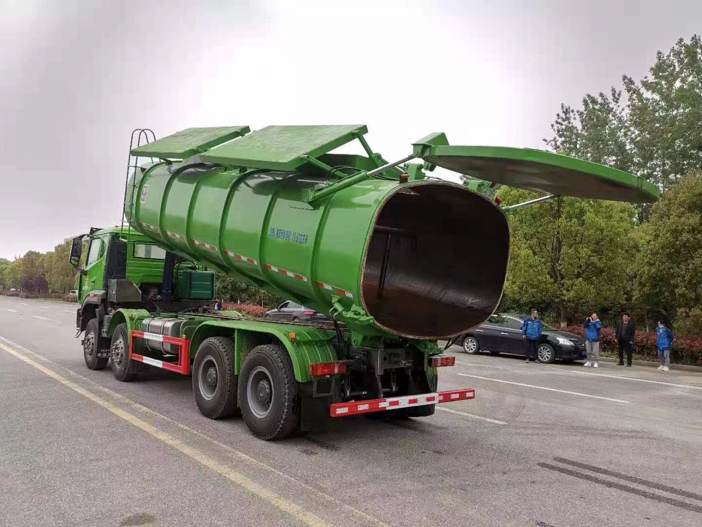 我們見識到廢污泥罐式車大多是密封罐體的,頂部蓋不可開啟,該款車型根據需求設計,頂部全部做液壓可開啟的。該車采用的是重汽豪瀚H77L駕駛室輕奢版;驅動8×4,發動機國六濰柴400馬力(型號:WP10H400E62),;HW19712L變速箱+HW50直聯式取力器;H653自調臂前軸(鼓);MCP16ZG自調臂雙后橋(鼓);速比5.26;雙層車架(8+5/300);軸距1800+3800+1350,前后標準版多片簧(11/11/12);多功能方向盤;電動電加熱后視鏡;主氣囊+副簡易型座椅;國產方向機;標準版排氣系統;ABS(4S/4M);高位保險杠(金屬);12.00R20(混合花紋);手電一體電動舉升;400L油箱;中國重汽智能通D版;終端排放監控裝置;