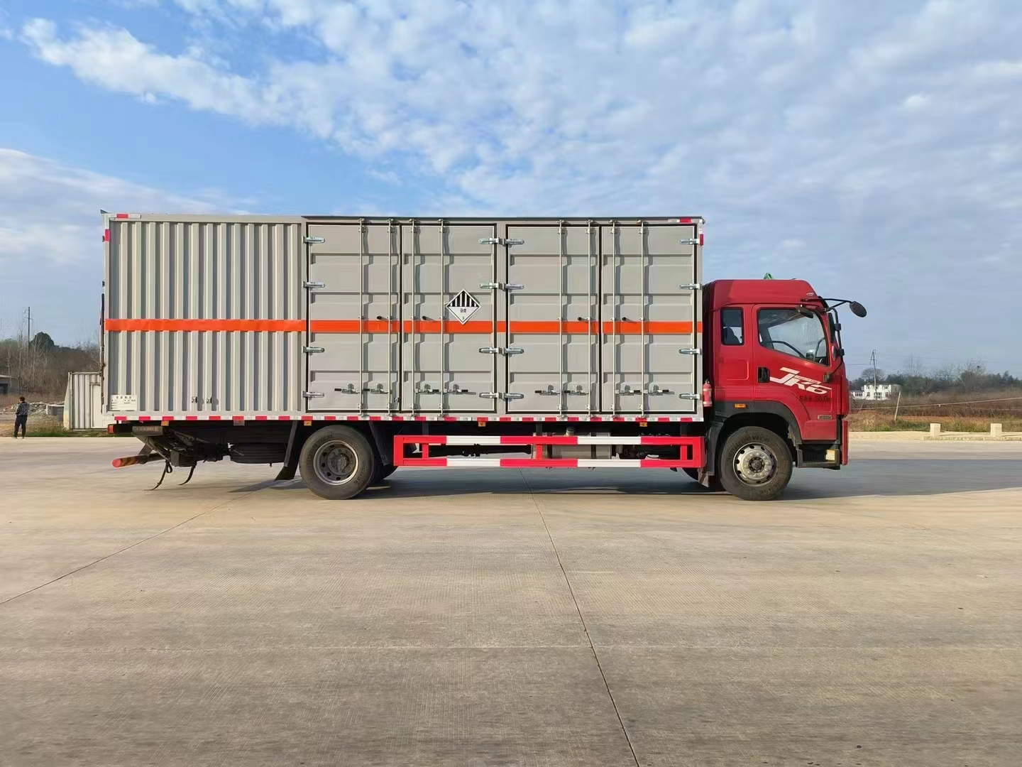 解放JK6國六危險品車貨箱尺寸可選7800/7200/6800mm,箱體內寬度可選2450/2380mm,廂體內高度:2600,2400,2000mm。需要注意的是箱體內高2.6米是目前裝載貨物少有的車型。滿足多元化需求,高度寬度選擇更自由。該車額載根據用戶需求可選9.9噸和10.35噸(兩個噸位購買保險區別大)。