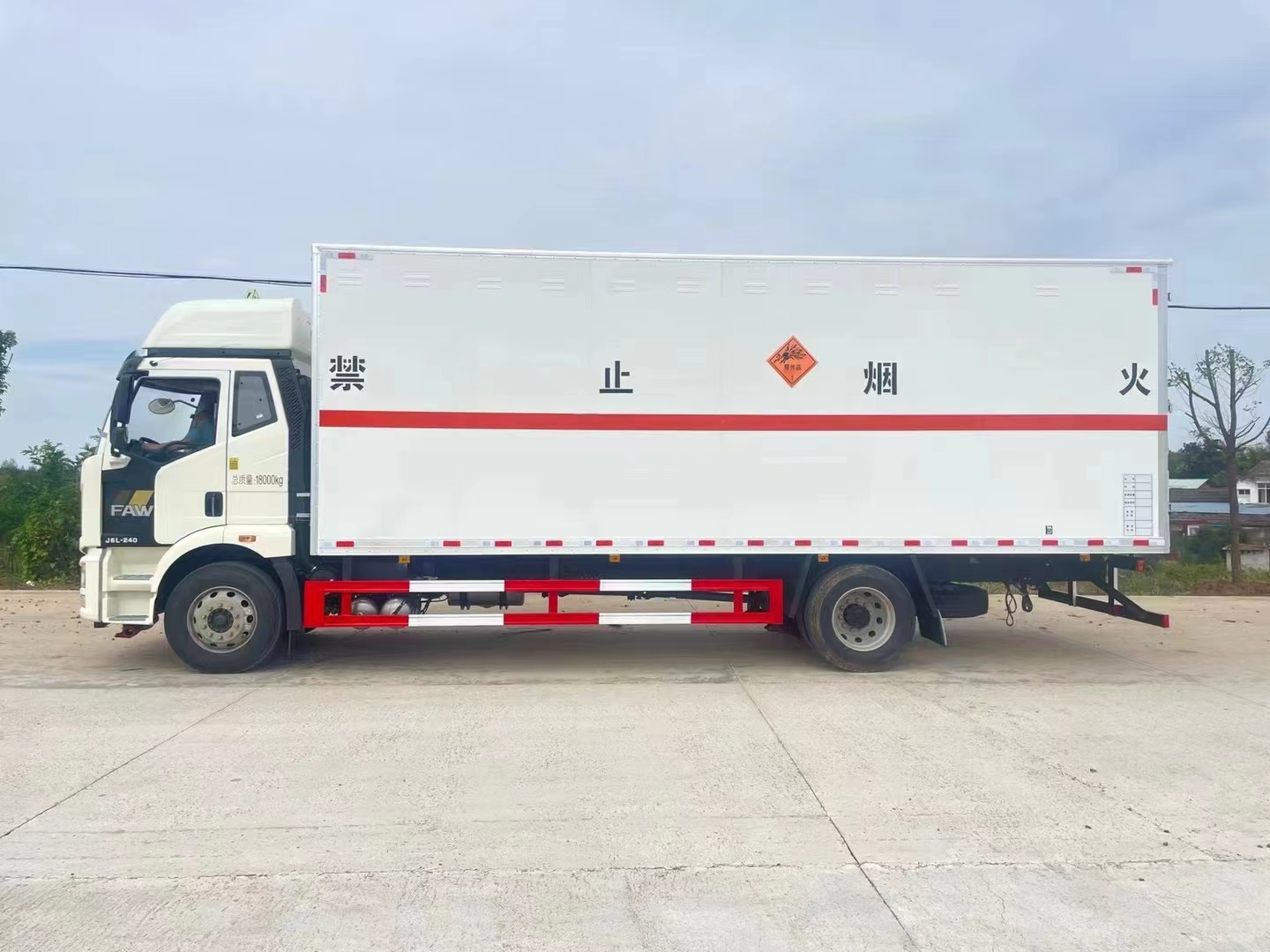 解放J6L國六7米8爆破器材運輸車箱體容積可達50立方,尾部可加裝液壓尾板,顏色可定制軍綠色,箱體為雙層金屬骨架結構,外冷軋鋼板內飾鋁板,內壁采用鋁合金板蒙面,夾層為隔熱阻燃材料填充,廂體內部做通風窗口,中開側門,廂體內部做防靜電處理,廂體底部鋪導靜電膠板,車輛副梁配備導靜電帶,廂體內襯壁裝單排臥環,廂體內頂部安裝煙感報警器,廂體安裝防盜報警器。隨車配備手提滅火器,危險品三角頂燈,防護帽等,嚴格按照國家危險品法規進行“爆”標識粘貼等。隨車提供資料:機動車購車發票,整車合格證,隨車工具,服務手冊,保修手冊。