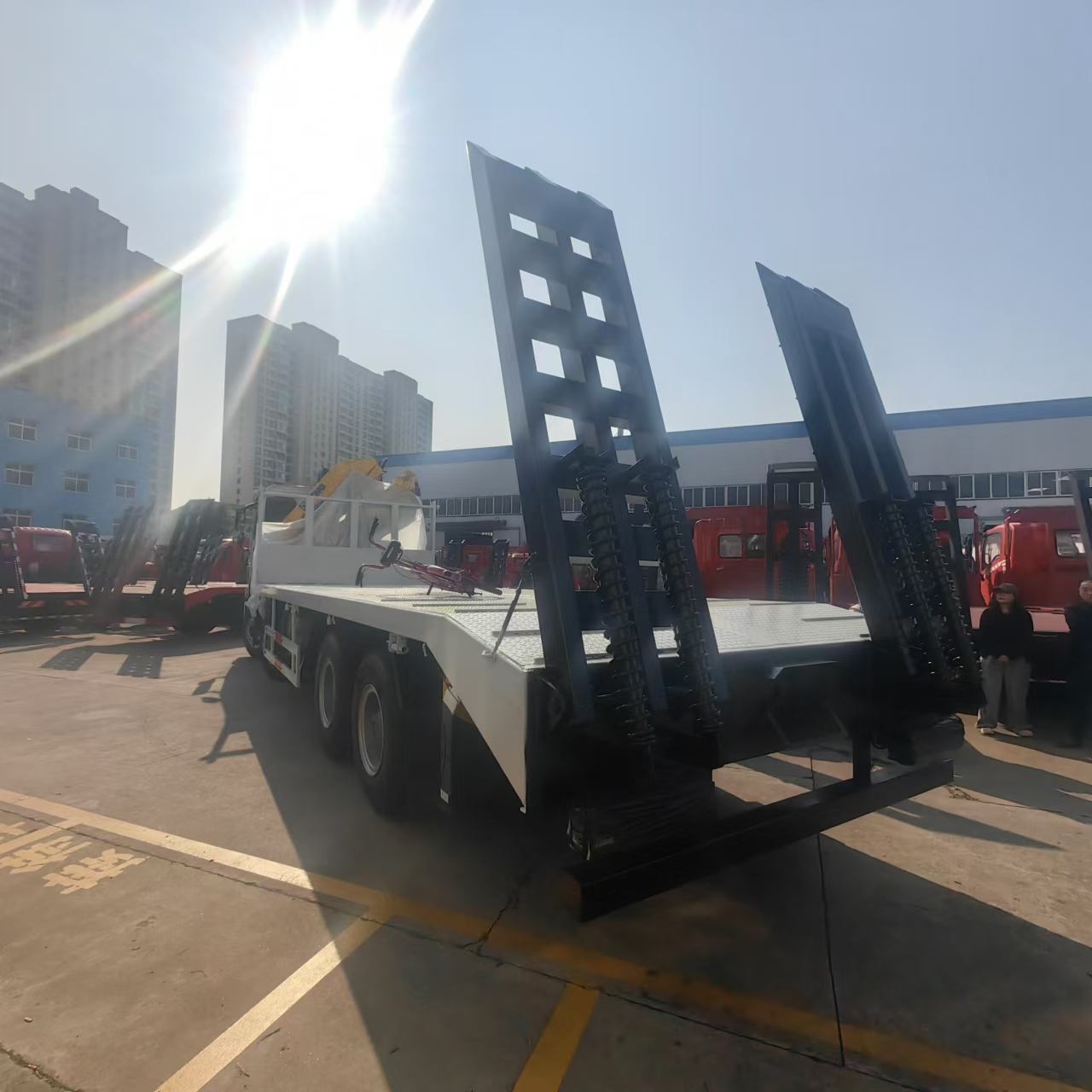 重汽豪沃前四后八帶吊國六平板運輸車選用的是濰柴350馬力,豪沃12檔帶高低速,13噸加強型后橋。荷載18噸不在話下。上裝采用的是6個厚U型折彎件平大梁焊接,全包大梁。面板8個厚,可按照要求定制雙節(jié)折疊爬梯,伸寬功能,也可遙控控制保障用戶的快捷方便。