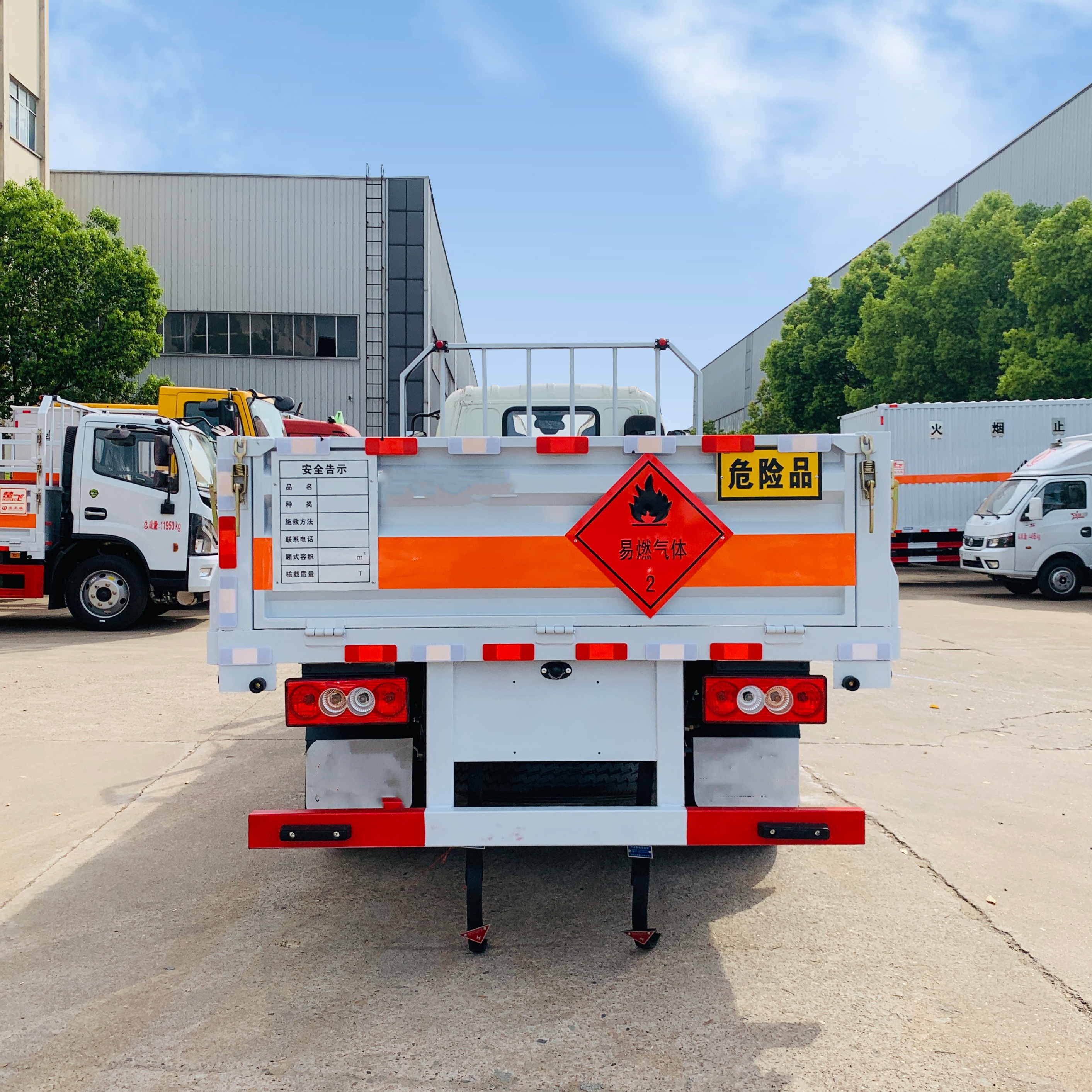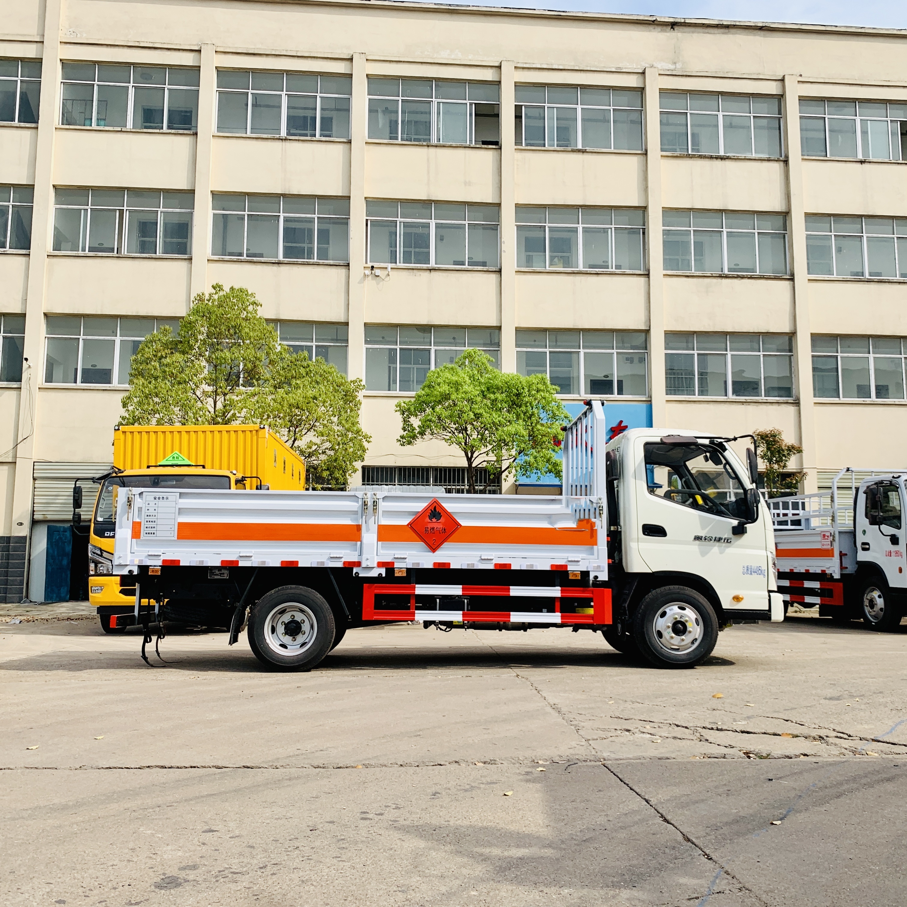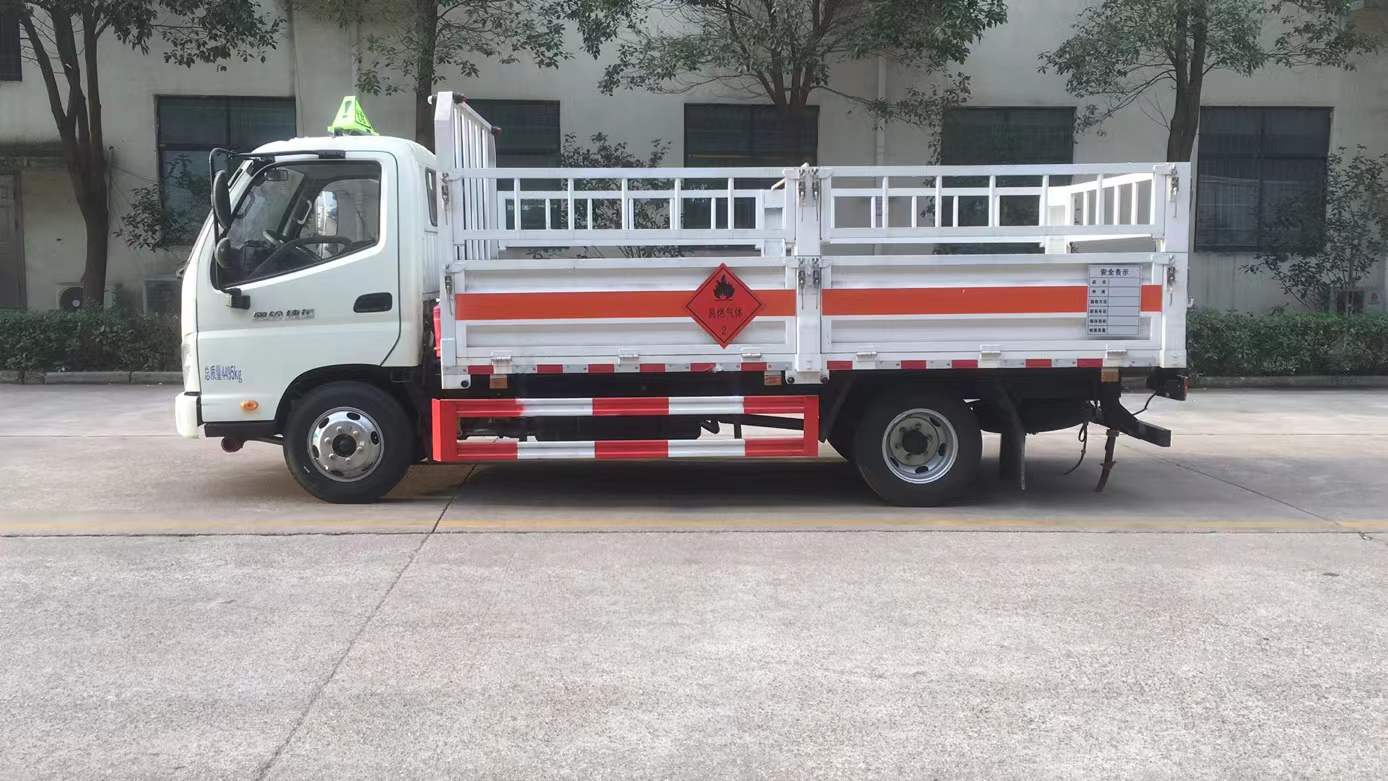 福田奧鈴國六藍牌氣瓶運輸車廂體邊板采用瓦楞結構,底板上方鋪防靜電膠皮,選裝可拆卸高欄,活動立柱,底板做防銹處理。箱體采用雙組份丙稀酸油漆制作,所有合頁均為熱鍍鋅材質。選裝液壓升降尾板。整車國標反光標示及警告標志 (隨車工具,滅火器,三角頂燈,危險品標識,拖地靜電帶),其他按照公告標準制作。