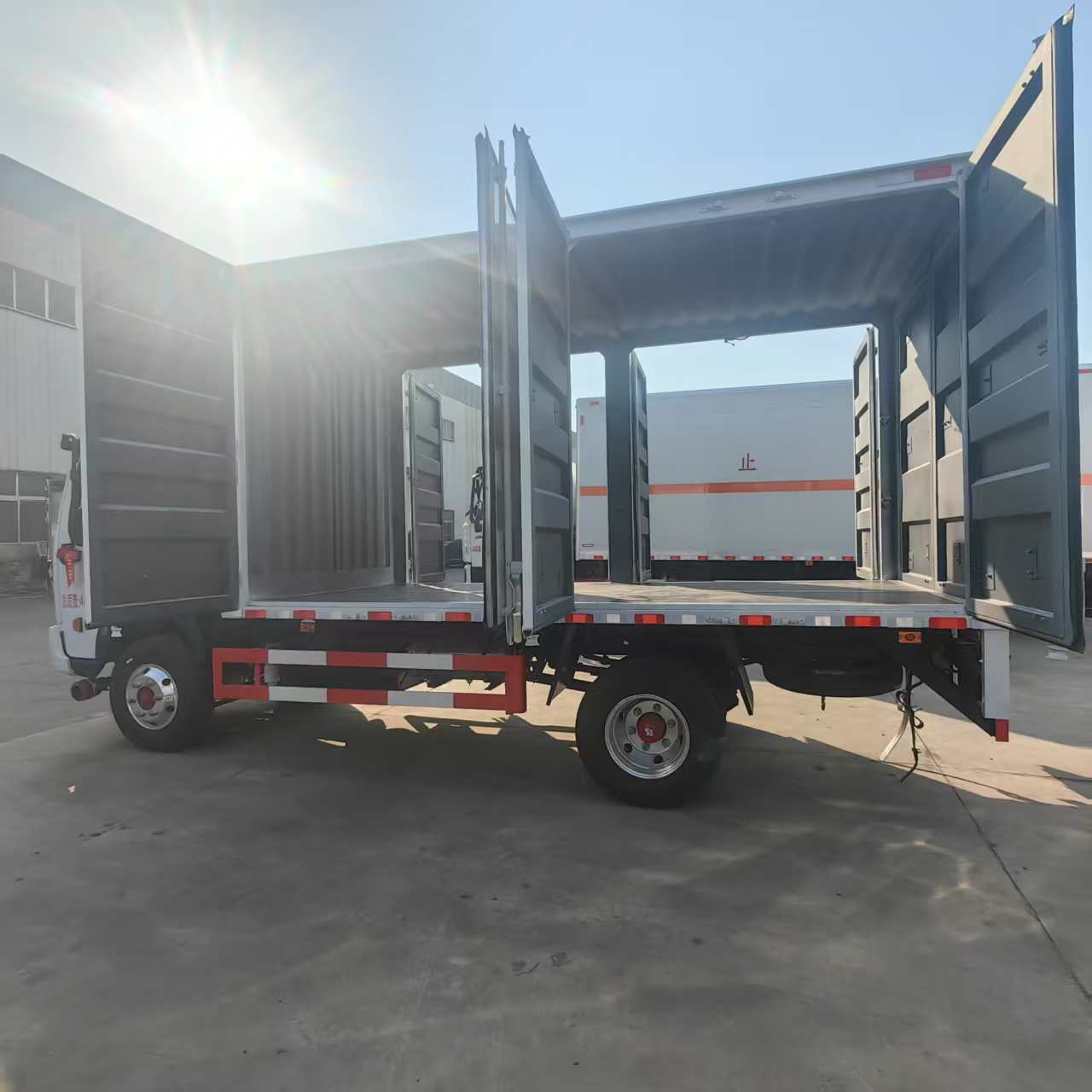 叉車裝貨不好裝,想要從側門裝,又想要貨物方便擺貨,一款帶左右開門的車型。今天為您推薦的是東風多利卡藍牌全開門危險品車,以下是詳細配置介紹: