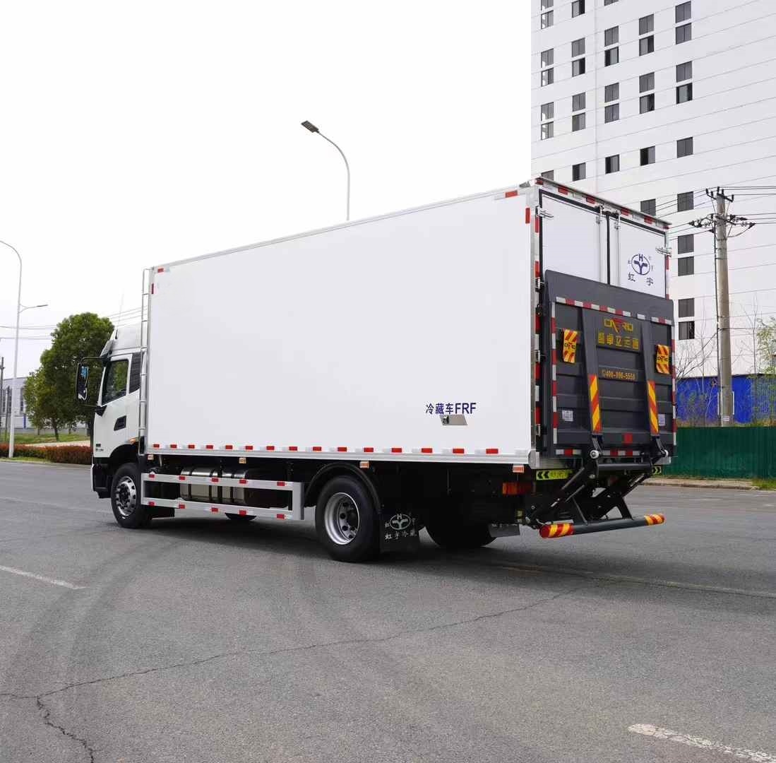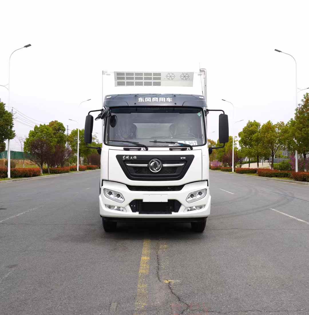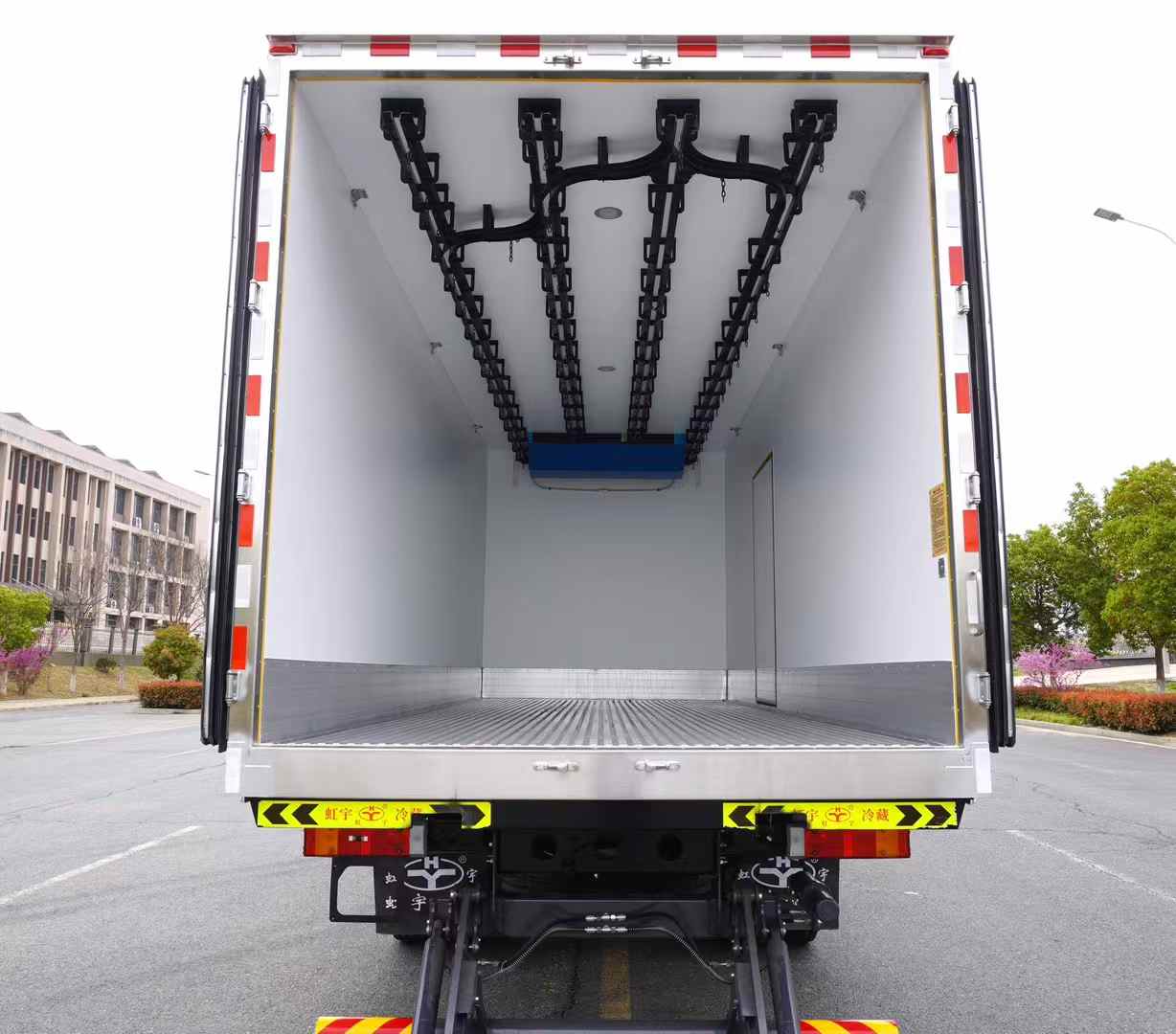 東風天錦KR國六法士特8檔冷藏車選用的是2025款D560KR高頂雙臥駕駛室,法士特8檔變速箱,駕駛室液壓電動翻轉,帶空調,可調節氣囊主座椅,多媒體大屏,多功能方向盤,前后攝像, 前/后橋4.5/9T,大梁220×75×7,板簧片數8/10+8,400L鋁油箱,速比3.64,275/80R22.5 18PR輪胎,140Ah蓄電池,2人座軸距:5000mm,整車型號:DFH5180XLCEX7,整車尺寸:9200*2600*3960(mm),箱體尺寸:6800*2440*2500(mm)。選用的是康明斯290馬力發動機,箱體選用的是內外玻璃鋼,中間夾的保溫材質,根據運輸肉鉤的要求該車匹配的是肉鉤專用箱體,帶滑道。為了上平臺更方便,該車尾部可加裝液壓尾板,整車不超重。