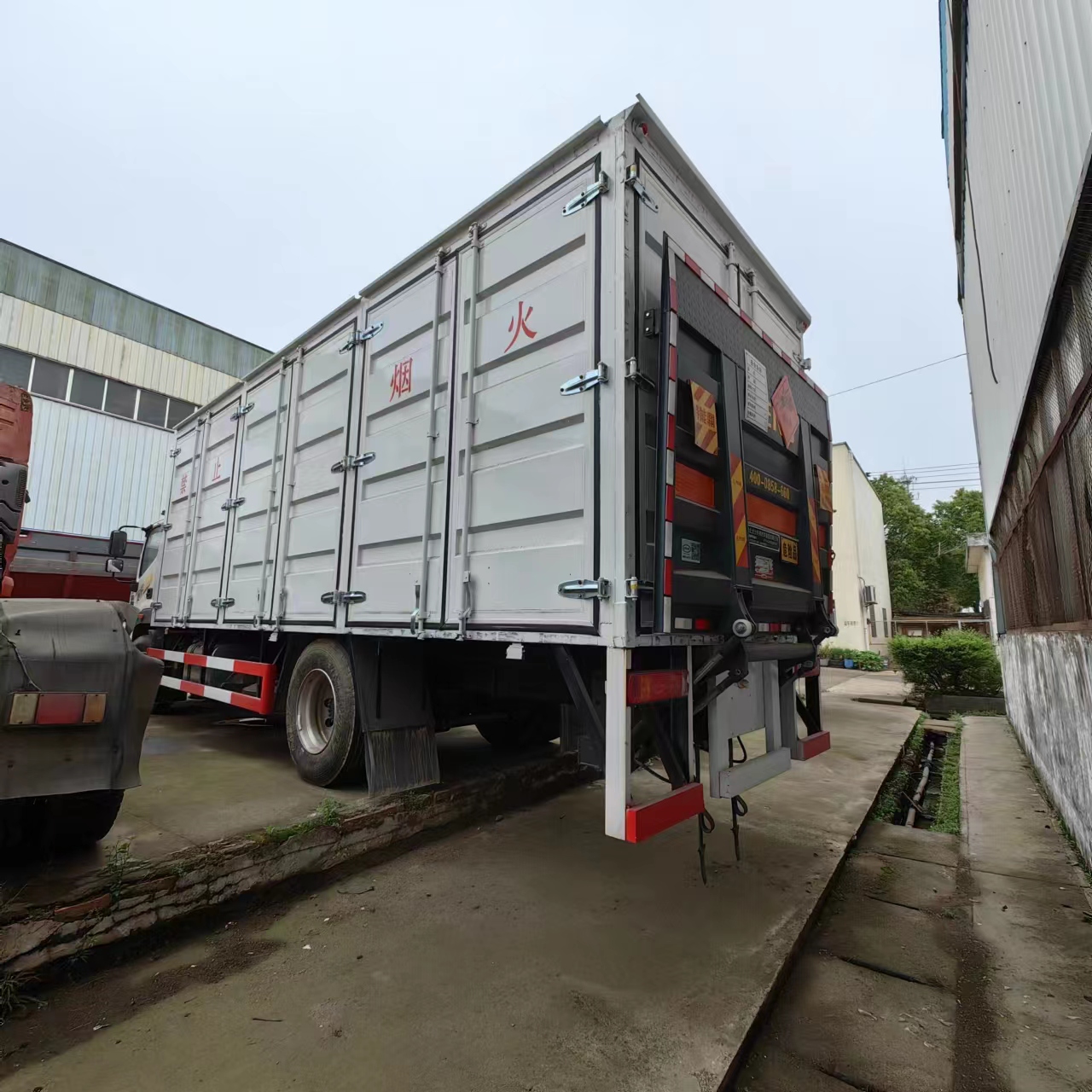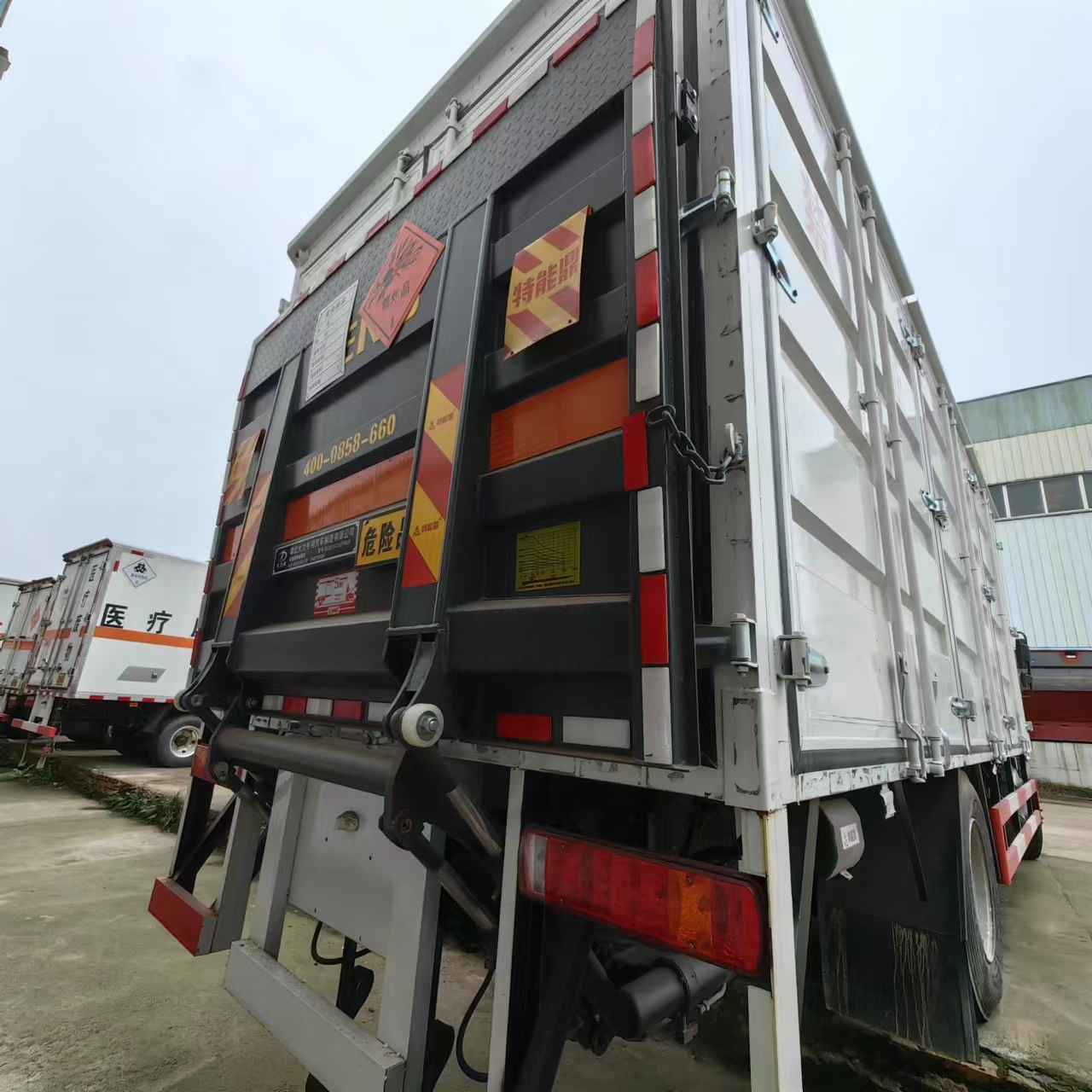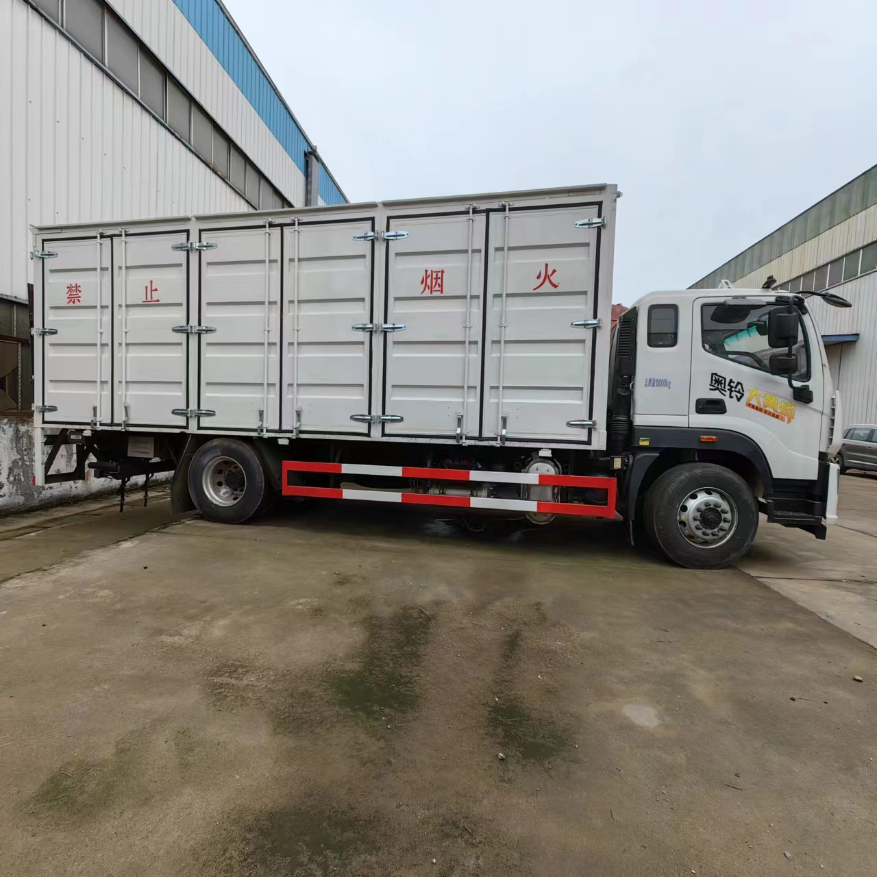 福田大黃蜂國六6米8危險品車采用廂式欄板車結構,外厚度為1.1毫米厚度武鋼冷軋鋼板(或沖壓成瓦楞板,以公告為準),內加強“幾”字型加強梁,車體底板加強處理并做防靜電處理。車體的左側、右側,和后欄板栓鉤結構,可向下打開,方便上下貨物,車體為空曠式車型,大大減少了運輸物品因為狹窄空和強烈碰撞產生氣瓶爆炸的危險性,箱體外觀涂裝白色油漆,在欄板的中間位置粘貼橙色的;嚇藥В⒃谲圀w的左、右、后部粘貼“易燃氣體”或“不燃氣體”標識。駕駛室內部配備兩只滅火器,后杠處安裝防追尾事故的緩沖固定塊。此款車輛屬于國家規定的危險品二類危險品運輸車。