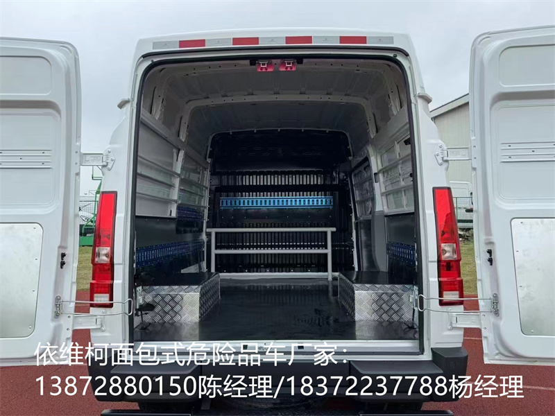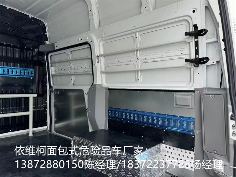 依維柯面包式易燃液體廂式車貨箱全盲窗,后門形式180度開啟雙開門,70L塑料油箱,ABS,排氣輔助制動系統(tǒng),電磁式電源總開關,前霧燈,電動調節(jié)大燈,普通前大燈,前輪爆胎保險裝置,雙預警:車道偏離預警LDWS和前碰撞預警FCWS。車廂一周粘貼橙色放光帶,廂體底板上加裝綁扎環(huán),箱體粘貼 菱形告示牌,安全告示牌,危險品牌,拖地靜電帶。