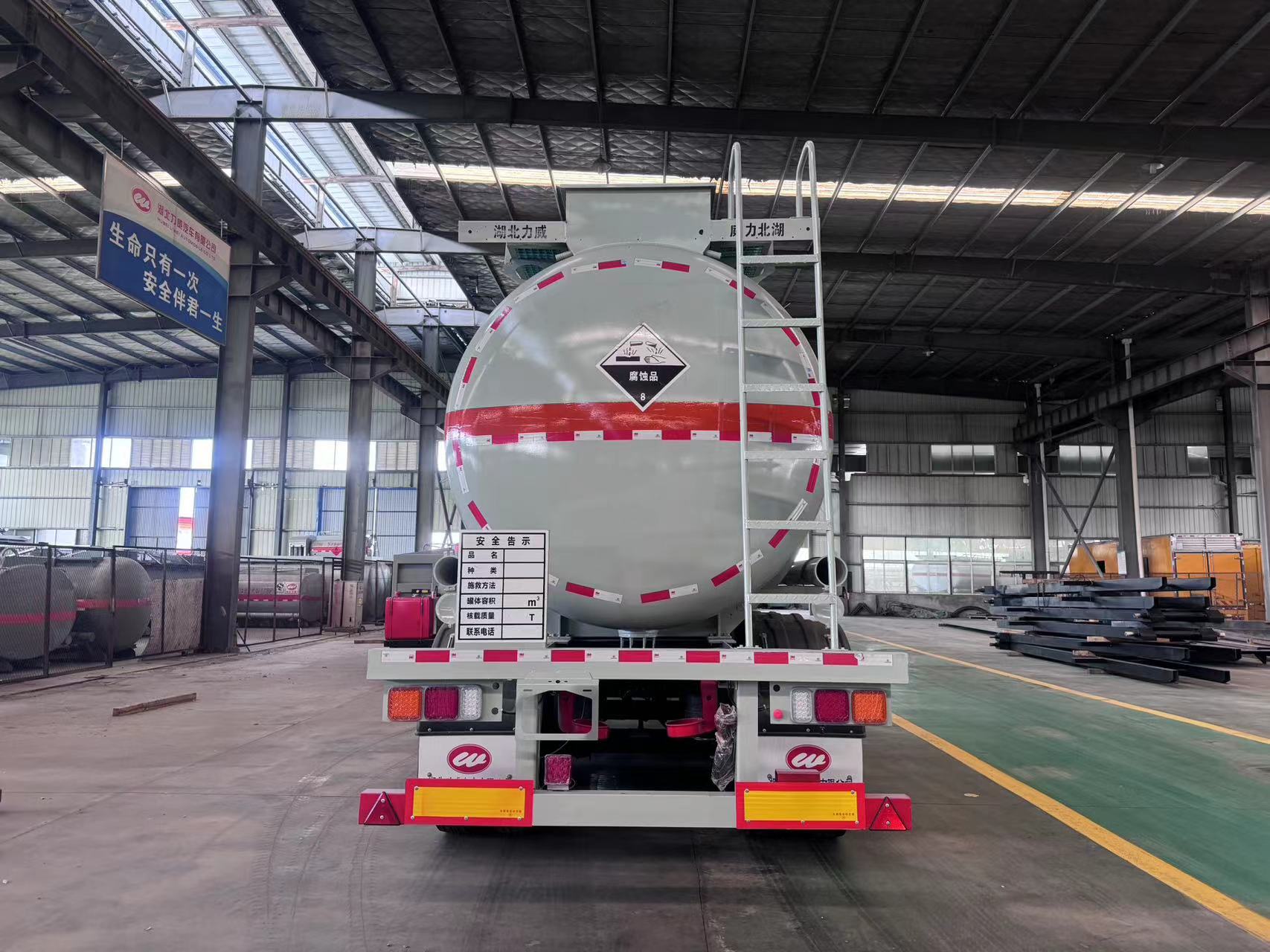 36方雜項(xiàng)罐式半掛車 整車型號(hào)為HLW9403GZW型雜項(xiàng)危險(xiǎn)物品罐式運(yùn)輸半掛車,罐體總?cè)萘浚?6立方,嚴(yán)格按照公告尺寸及公告圖片生產(chǎn)制作,罐體材料為Q235B型碳鋼板材,5.2mm厚,罐體通倉,兩個(gè)鋁合金歐標(biāo)罐口蓋,罐口帶方盒子式上圍板,帶一套DN100鋁合金海底閥(海底閥帶聲光報(bào)警裝置),罐體尾部大梁下左右各一個(gè)DN80型鋁合金球閥出料帶碳鋼保護(hù)箱,帶護(hù)欄,走道,尾部爬梯,兩根卸料軟管,兩個(gè)滅火器,其余標(biāo)配。骨架部分:3軸富華車橋(帶空氣懸架,盤式),12條成山牌12R22.5 12PR輪胎,一、三軸帶EBS,50#牽引銷,帶28T單動(dòng)支腿,斷氣剎,制動(dòng)襯片報(bào)警,一個(gè)備胎架,不含備胎,安全告示牌,靜電拖地帶,其余按廠家標(biāo)配。