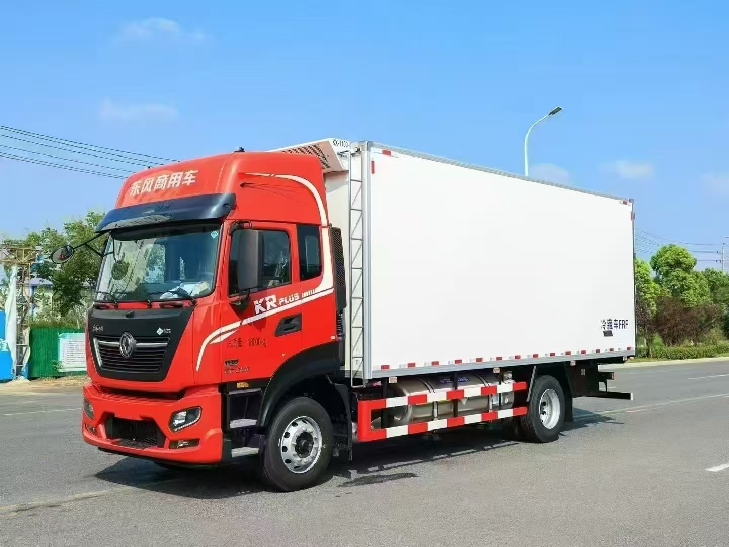 東風天錦PLUS康機280國六6.8米天然氣冷藏車選用高頂雙臥駕駛室,整車型號:DFH5180XLCEX26,D6.7NNS6B280發動機、8JSX110TM、自重:6.05噸,前/后橋4.5T/9T,大梁250x80x[7+4],板簧片數8/10+8,速比3.64,駕駛室液壓電動翻轉,2人座,多媒體大屏、四路監控、發電機90A,蓄電池165Ah,550L單氣瓶,鹵素大燈,冷機可根據客戶需求選裝國產冷機或進口冷機。貨箱尺寸:6800*2400*2520mm,軸距5000mm。275/80R22.5 18PR輪胎,額載9470kg。箱體選用的是專用玻璃鋼外形,中間夾阻燃材料,尾部可選裝帶液壓尾板外形。