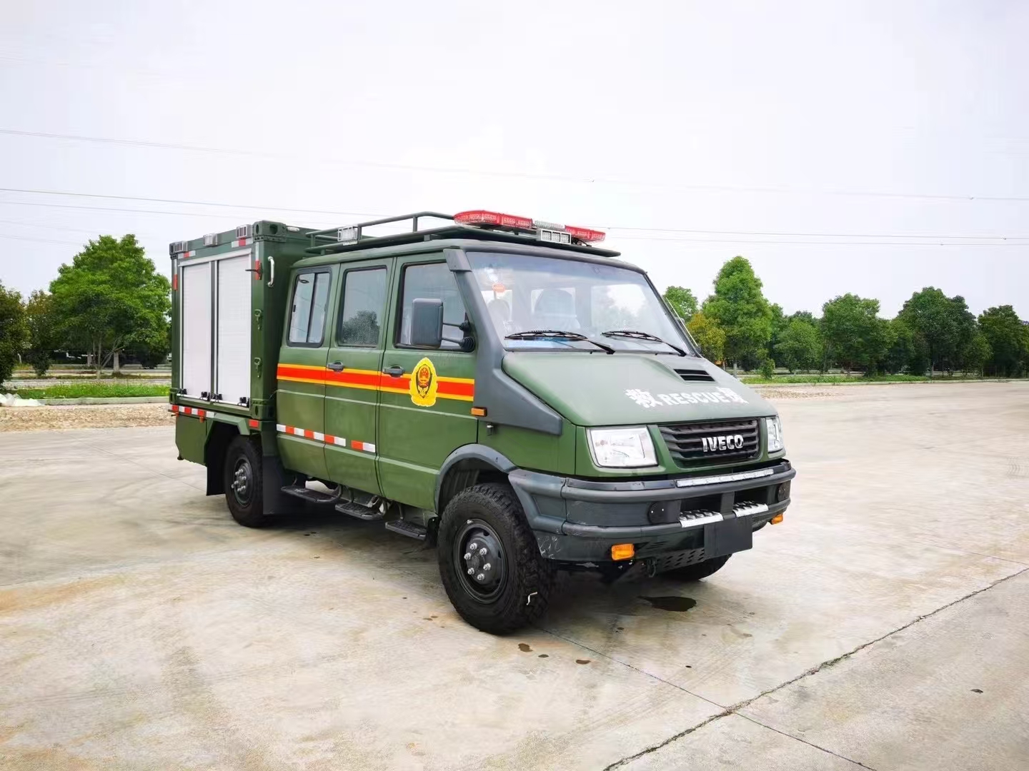 依維柯國六油田專用工具車采用的是歐霸雷霆四驅越野9座工程車,搭載升級版F1CE8481M發動機,132KW/180馬力,430N.m,軍工級電控全時四驅、電控換擋、 110L大容積油箱、主駕標配懸浮座椅、主副安全氣囊、預留后脫鉤橫梁,不選裝涉水喉理論涉水深度850mm,實際可達到1.1, LT265/75R16,爬坡度:軍標級60%。選裝爆胎應急安全裝置、360全景環視、駕駛員疲勞監測、BSD盲區監測、 前方碰撞預警(集成行人碰撞)、流媒體后視鏡、ACC自適應巡航、AEBS、LDWS。
