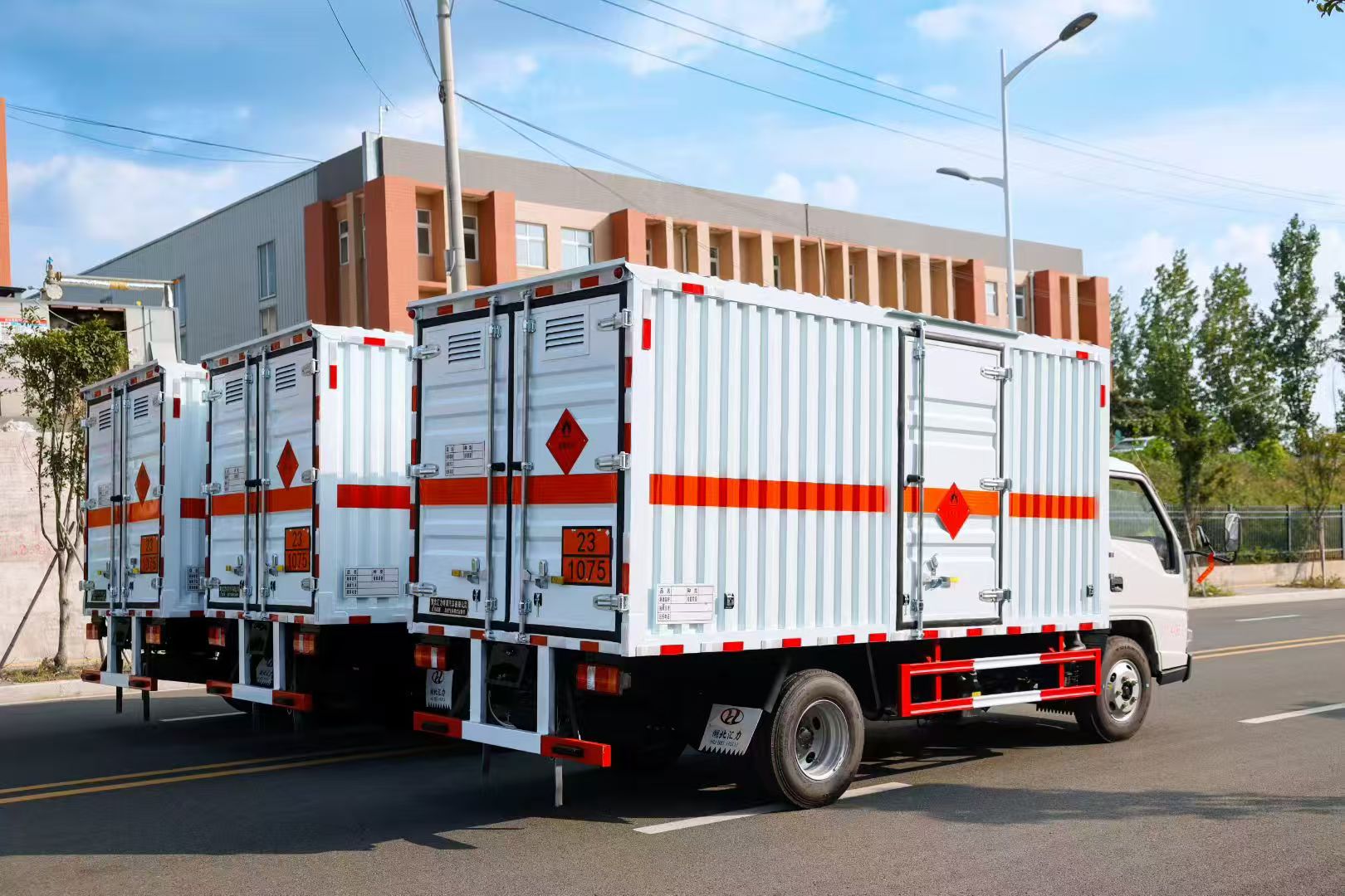 江鈴順達國六易燃氣體廂式車選用的是危險品車底盤,五十鈴122馬力發動機,輕量化底盤設計(鋁合金油箱+儲氣筒)降低自重,百公里油耗較同類車型低5%2;大油箱保障城市運輸公里續航,配合高效燃燒技術,年均節省油費超萬元9。三重主動防護帶排氣管前置、火花熄滅器,杜絕尾氣引燃風險。采用的是專用防爆箱體結構,瓦楞板+高強鋼邊梁抗扭曲。全車防靜電設計,符合危運標準。