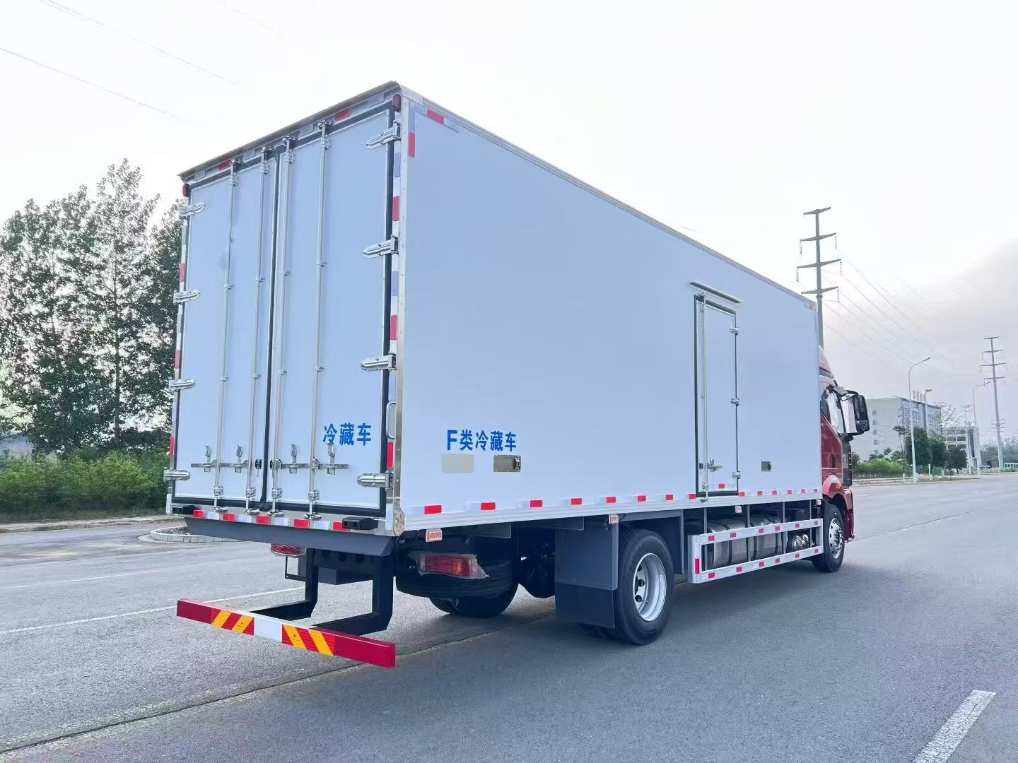 解放J6G國六大柴360馬力單橋6米8冷藏車整車型號:CA5181XLCP62K1L4E6,整車尺寸:9180x2600x4000mm,箱體尺寸:6800x2420x2500mm。選用的是大柴360馬力發動機,CA6DK2A36E65(SCR only),變速箱CA10TAX130S變速器(全鋁殼體、同步器),2025款J6G領航版全浮高頂排半平地板駕駛室,彩色儀表,電動玻璃,電動電加熱一體式后視鏡,側圍網兜,駕駛員真皮通風座椅(氣動腰托、變阻尼、雙扶手、集成式安全帶),副駕座墊翻折,帶1個24V電源接口,儀表臺USB接口,豪華版十寸大屏集成四方位影像,多功能大角度方向盤,760mm整體式臥鋪,智能語音控制,中控鎖,手機支架,高品質揚聲器,腳窩燈,車門下裝飾板,自動空調,600L鋁油箱,50L尿素罐,駕駛室四點空氣懸置,電動液壓舉升,鋁合金儲氣筒,150Ah蓄電池,電控風扇,電動燃油粗濾器,LED自動透鏡大燈,LED日行燈,懸架7/7+3,定速巡航,機箱橋體現10/10/10萬公里長換油周期,限速89km/h,怠速暖機,80A發電機,帶側圍側頂拉花,車身左側帶“領航版”字樣,237x75x6.5車架,后橋速比:3.727,輪胎:275/80R22.5型18層級無內胎(國內一線品牌、低滾阻),軸距5300mm。